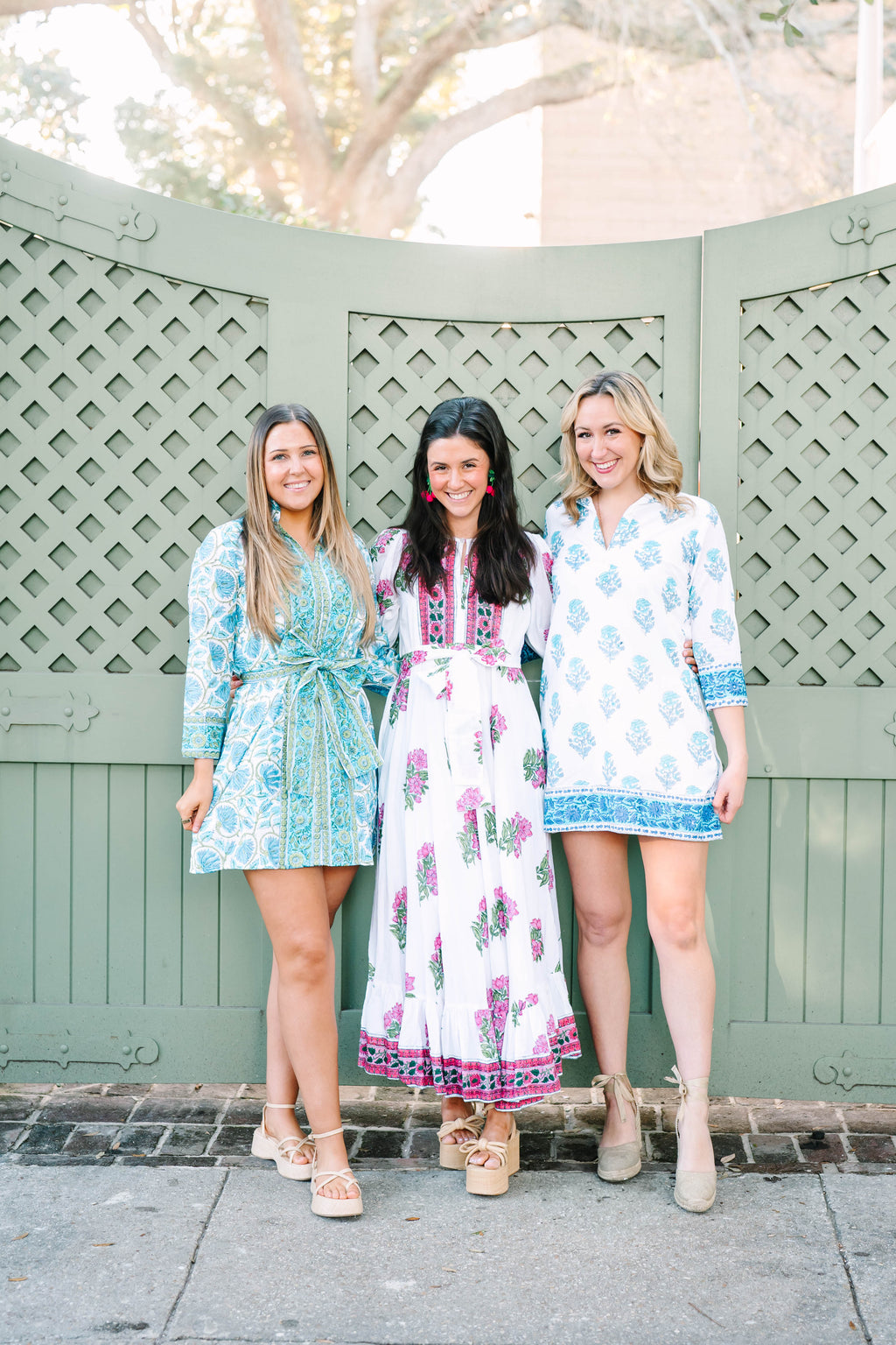 The Laurel features a v-neckline with a keyhole button closure, elbow length puff sleeves, and a long flowy maxi skirt. Complete the look with the matching self tie belt.