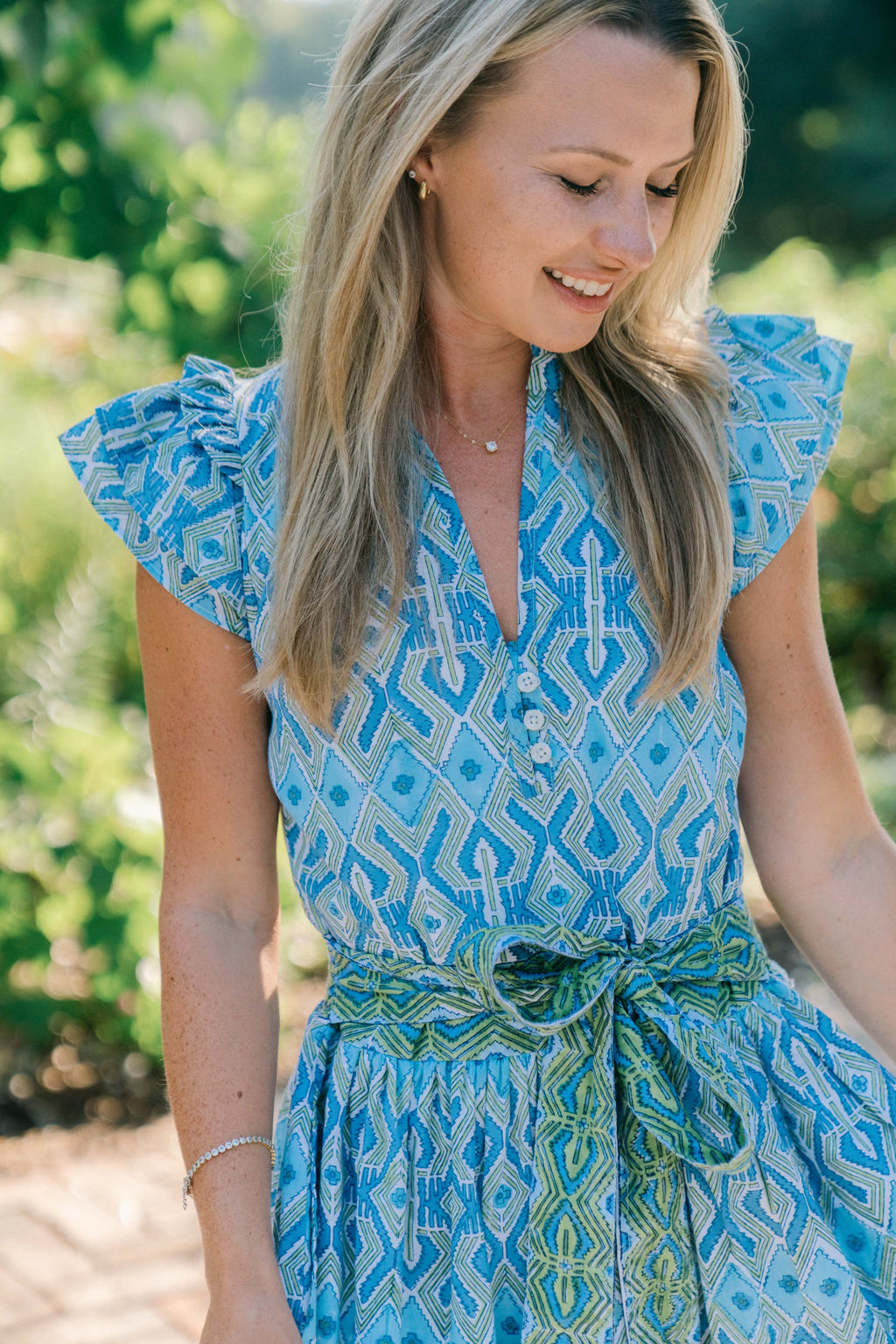 The Amie features a v-neckline, mandarin collar, short flutter sleeves, and a smocked waistline with an attached belt to define the waist for a tailored fit.