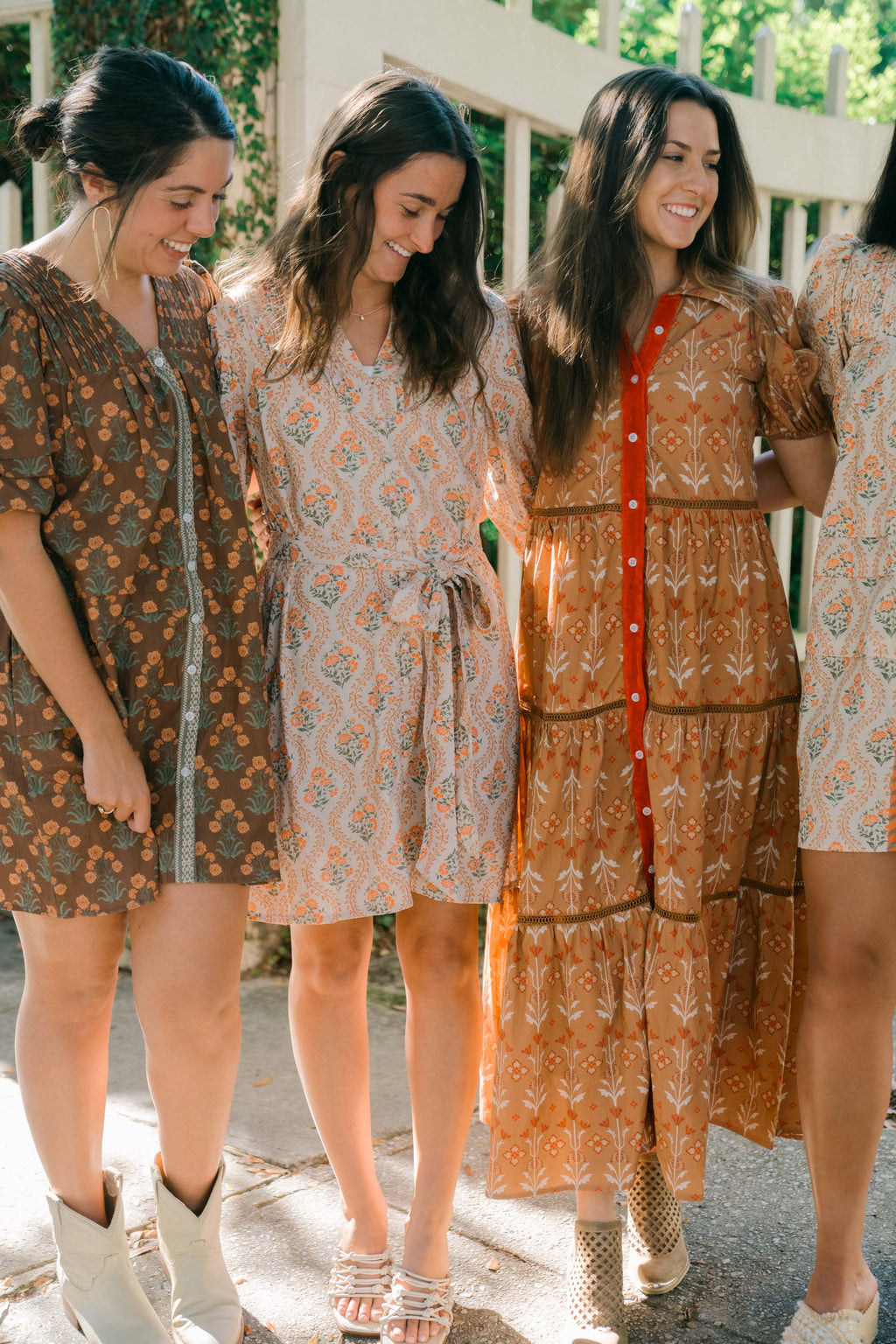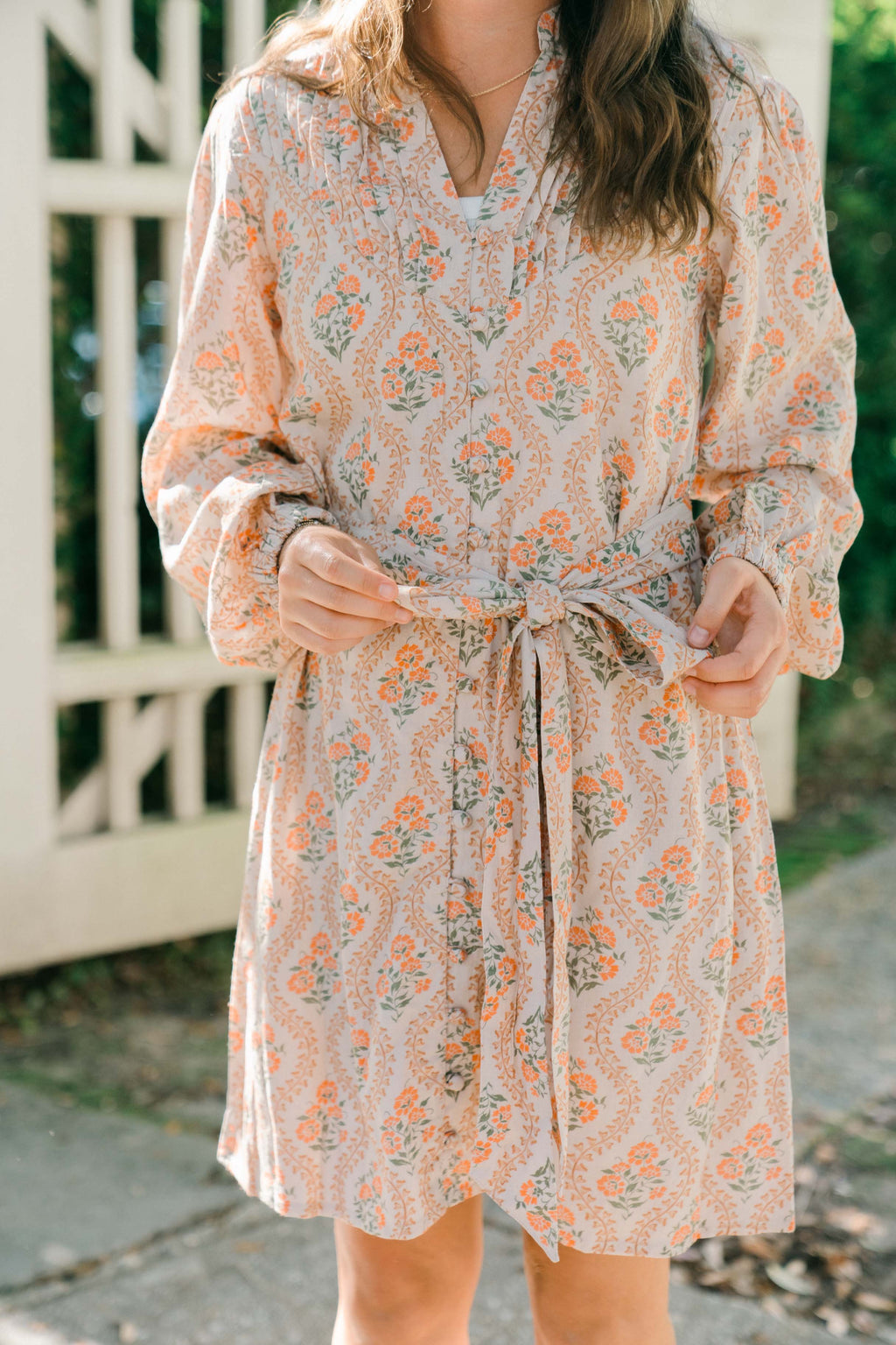 The Josie features a split neckline, button front placket, long blouson sleeves, and a matching tie belt.