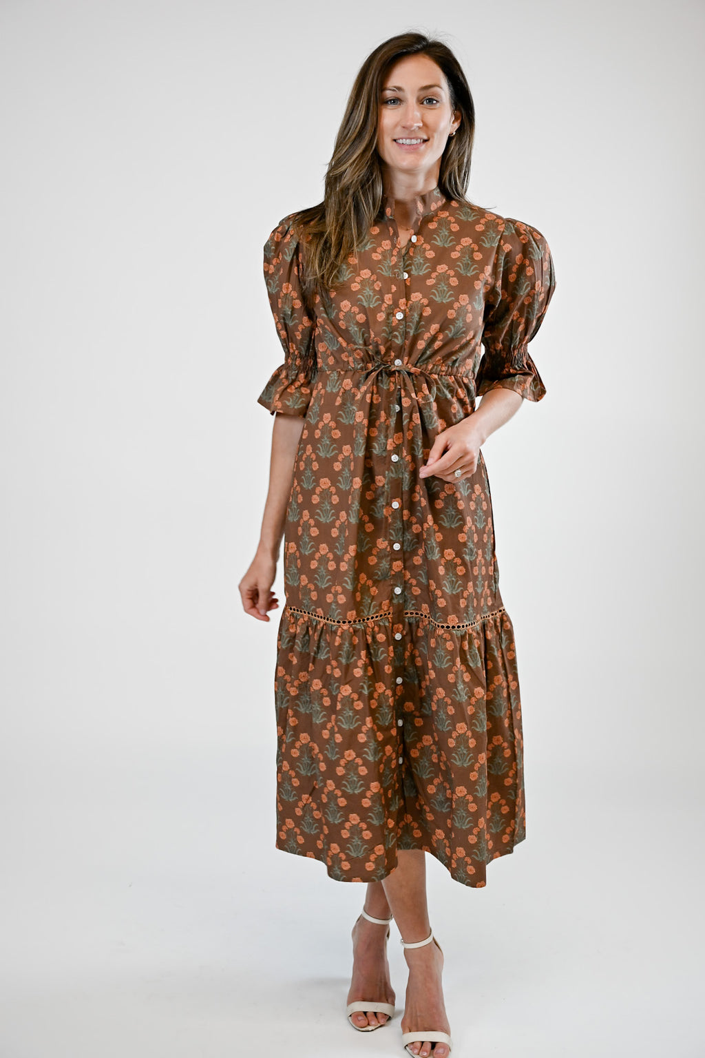 The Kai is our go-to adjustable waist maxi. It features a drawstring waist, button front placket, tiered skirt and 3/4 length flutter sleeves.