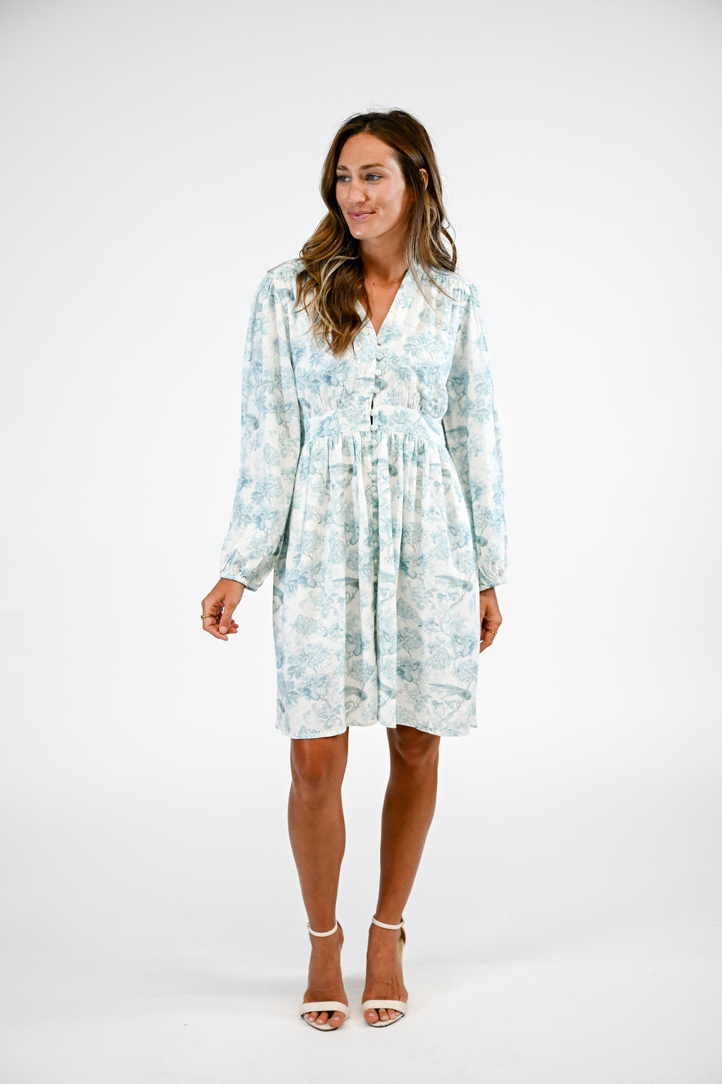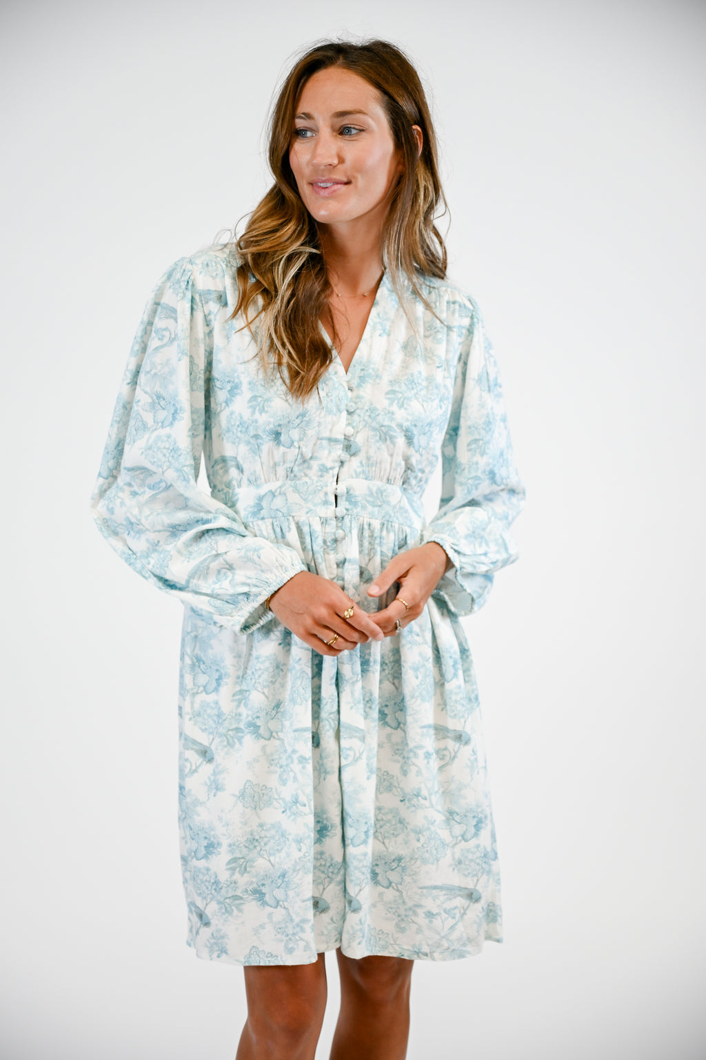 The Evelyn blouse features a structured mandarin collar, v-neckline, long sleeves with elasticated cuffs, and a banded waistline.