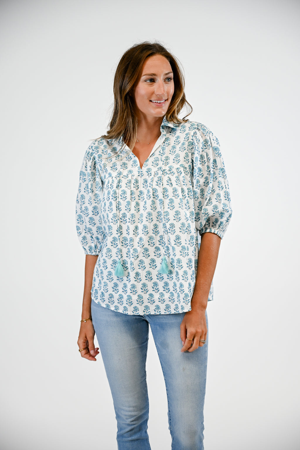 The Middleton Blouse combines timeless elegance with playful details. This piece features elbow-length sleeves, a V-neckline, and ruffle collar complemented by tassels. Perfect for those seeking a sophisticated yet distinctive blouse that transitions effortlessly from casual to dressy occasions.