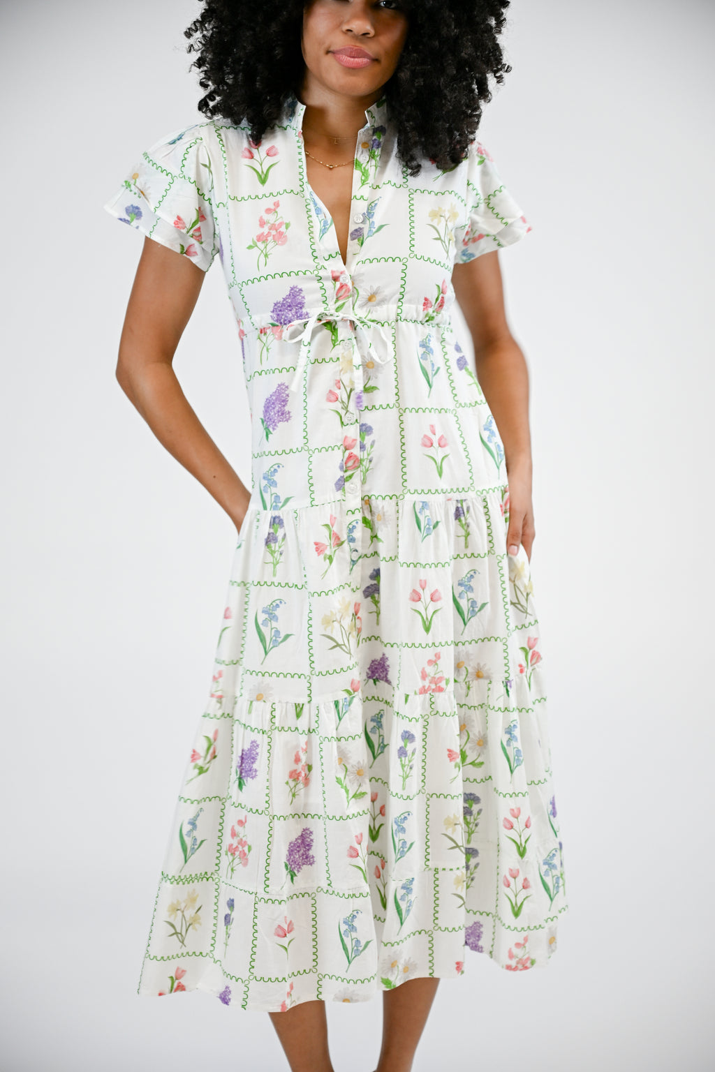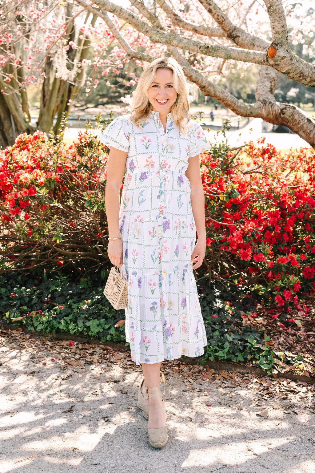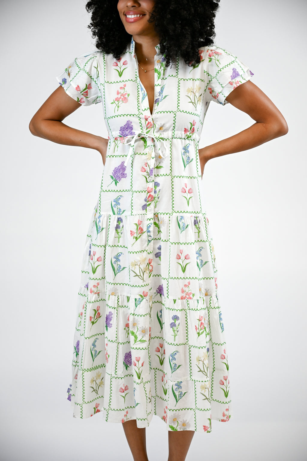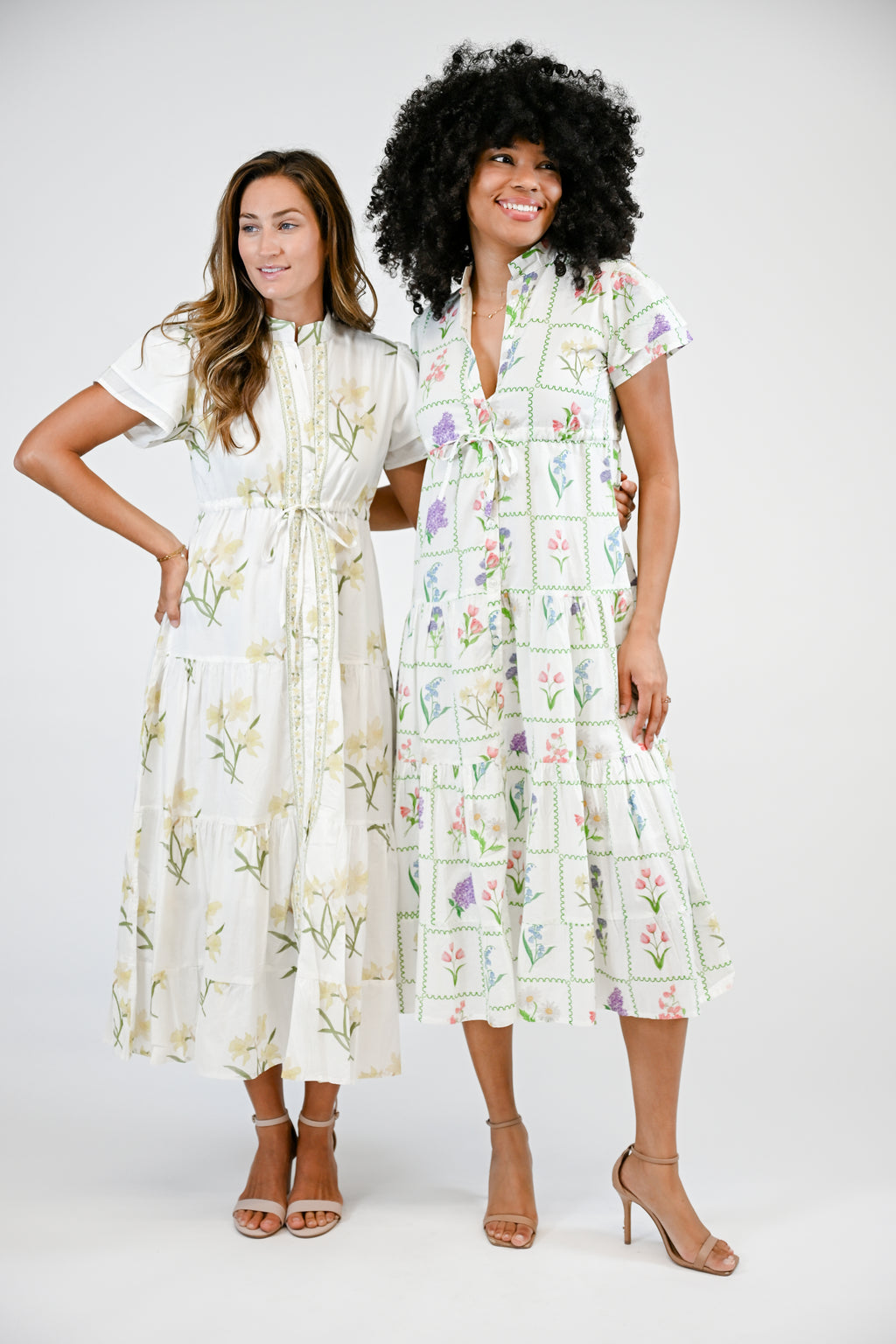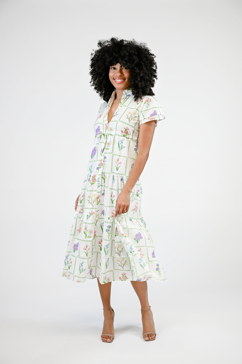 Our Magnolia Flutter Dress was designed after Magnolia Gardens in Charleston. It features a drawstring waist, four-tiered skirts, top-to-bottom contrasting trim, and buttons going upwards from the bottom of the dress to the bust.