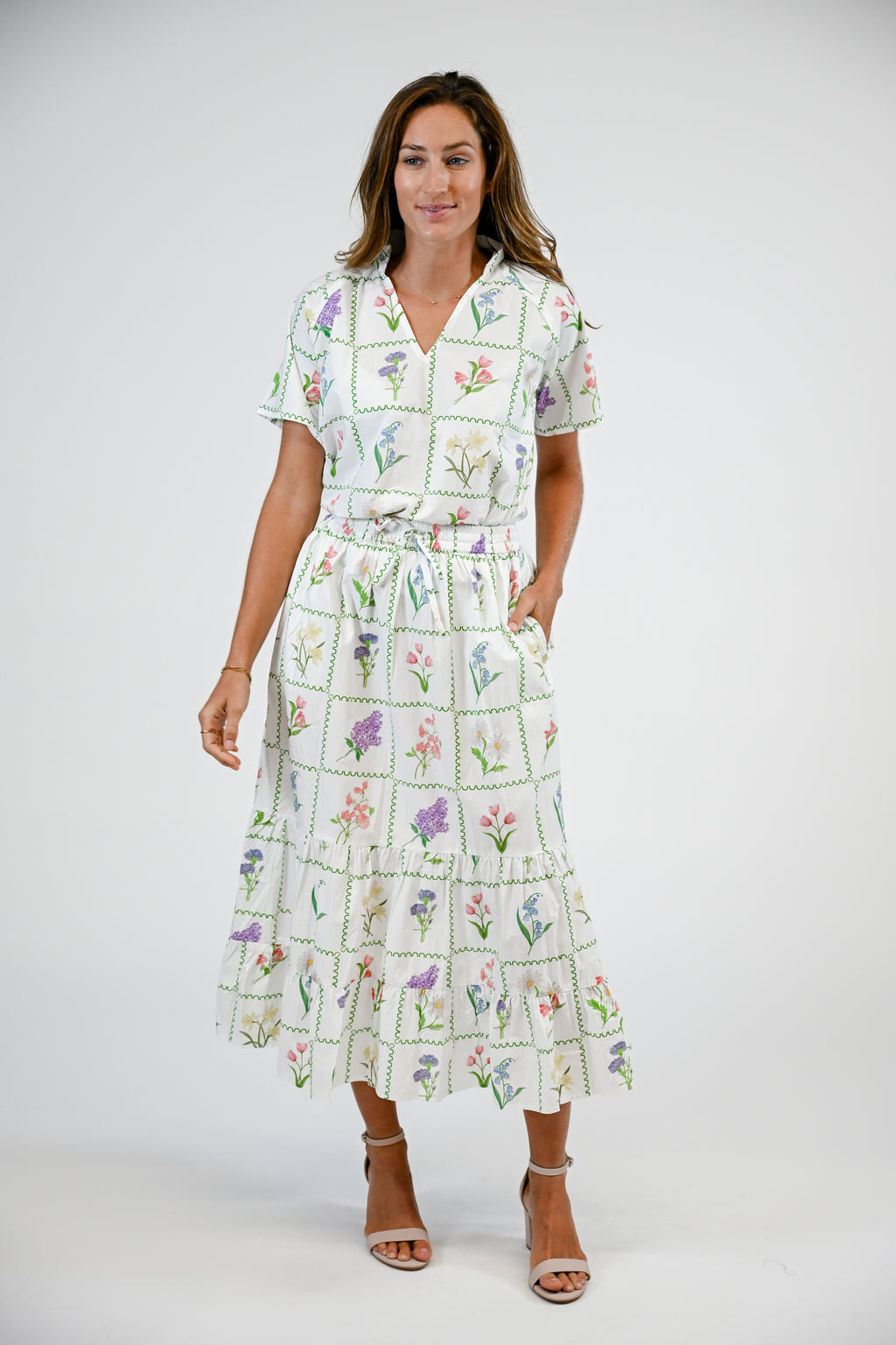 The Olivia Skirt is a 3 tiered maxi skirt that features an adjustable drawstring waistline, and side seam pockets. Pair with the Olivia Blouse for the perfect ensemble.