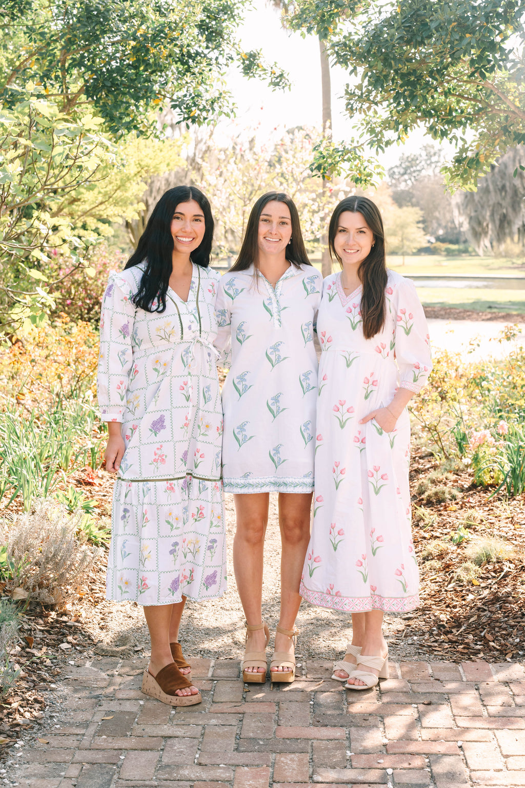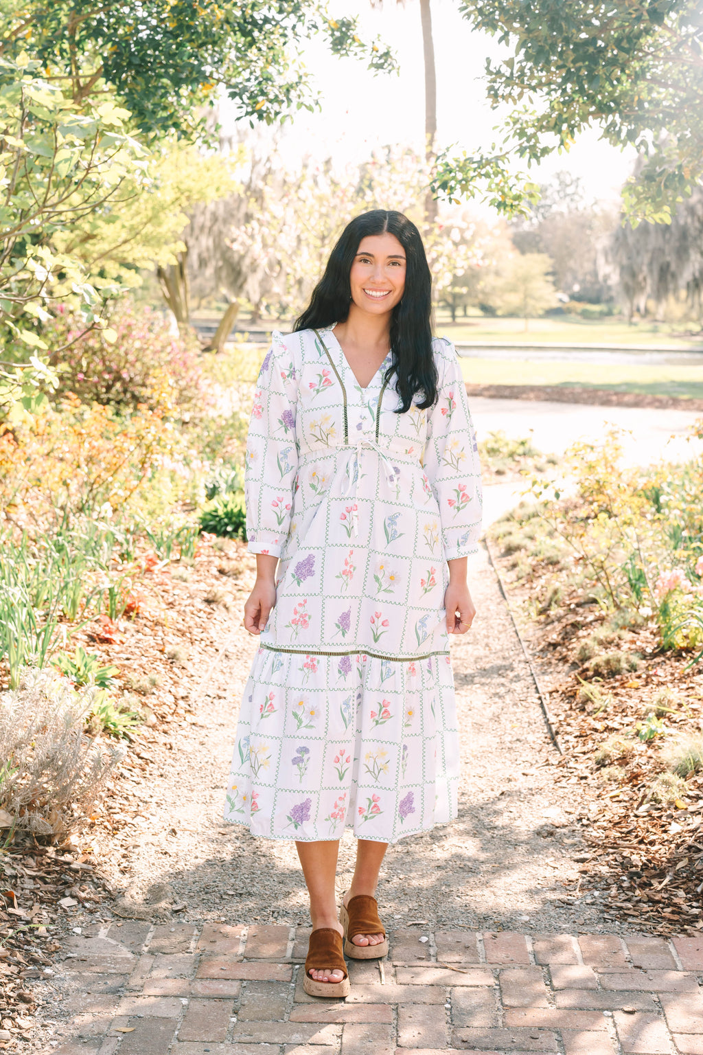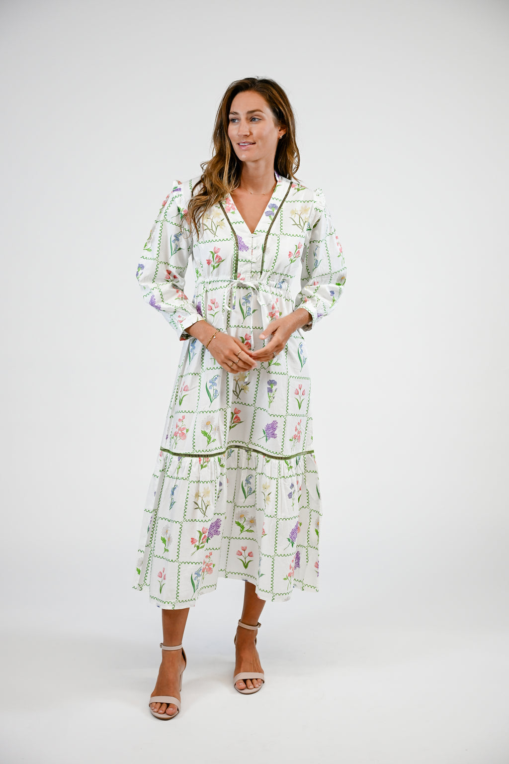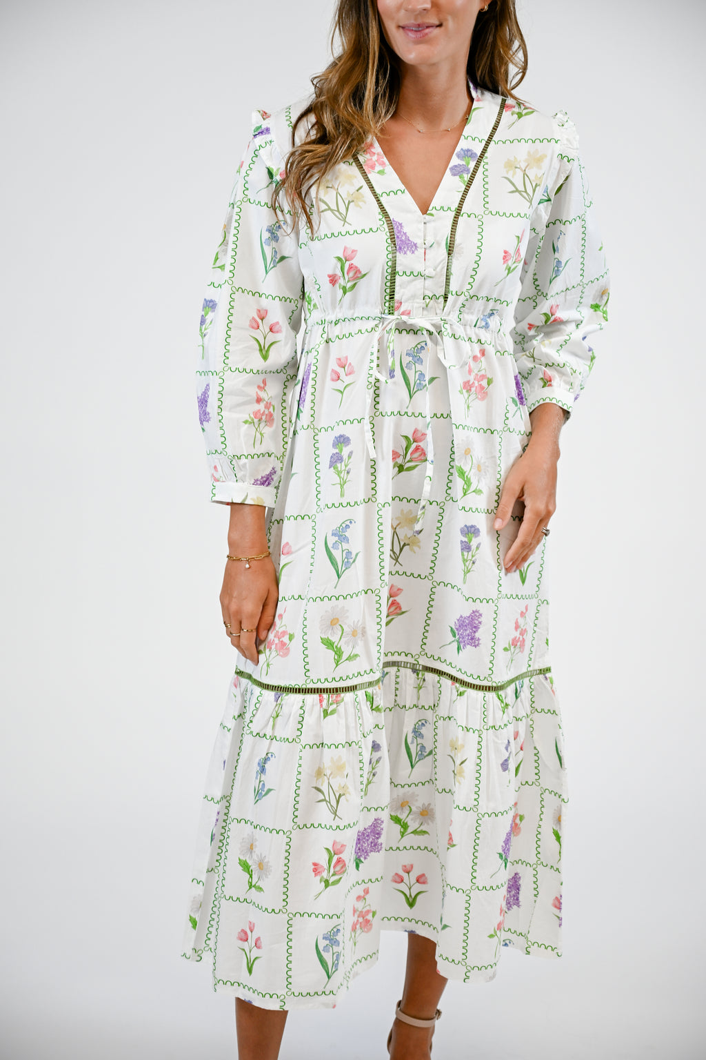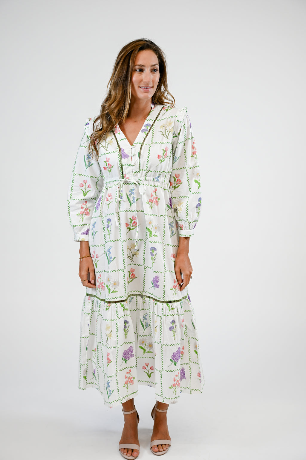 Introducing the Ansley. The Ansley features a button front closure, V-neckline with a stand collar, delicate ladder trim adorning the bodice and tiered skirt, and playful puff shoulders finished with frilly ruffles. A drawstring waist provides a flattering silhouette.