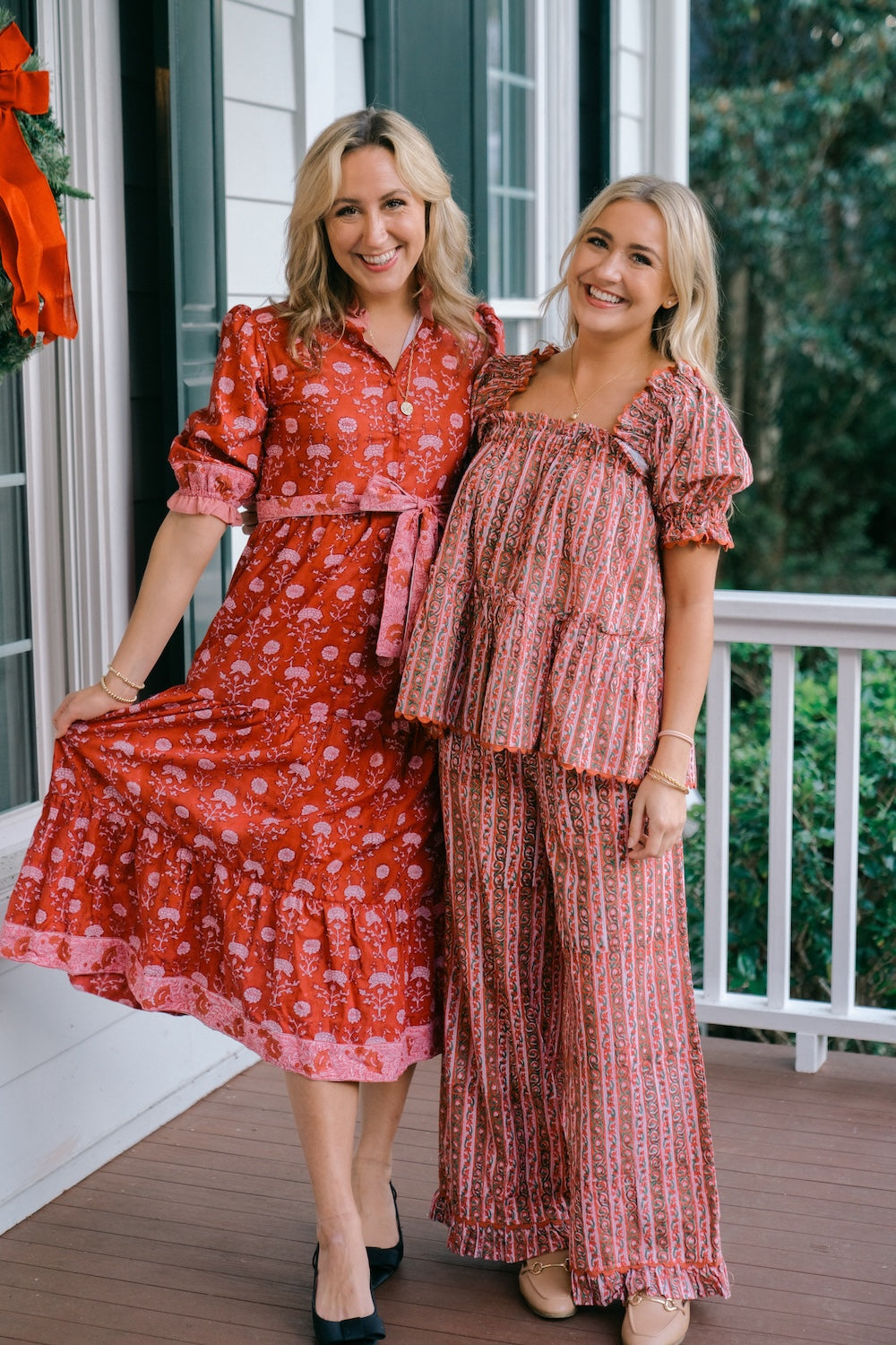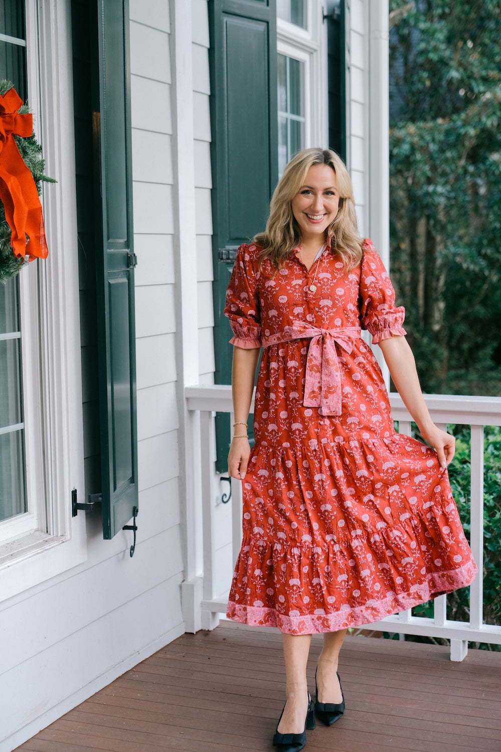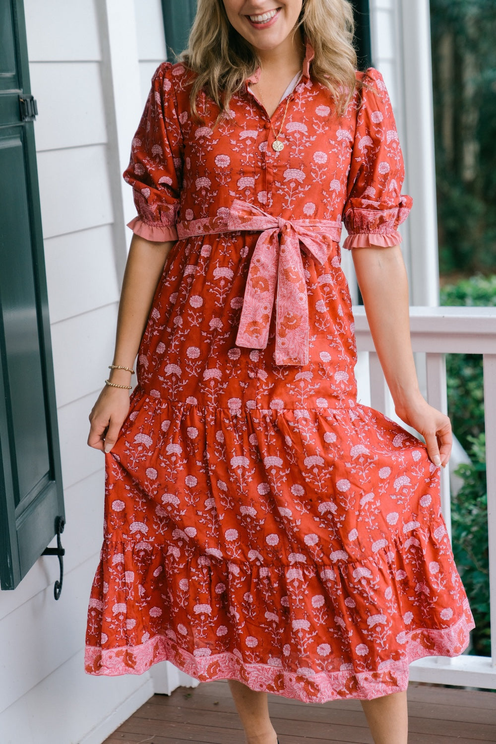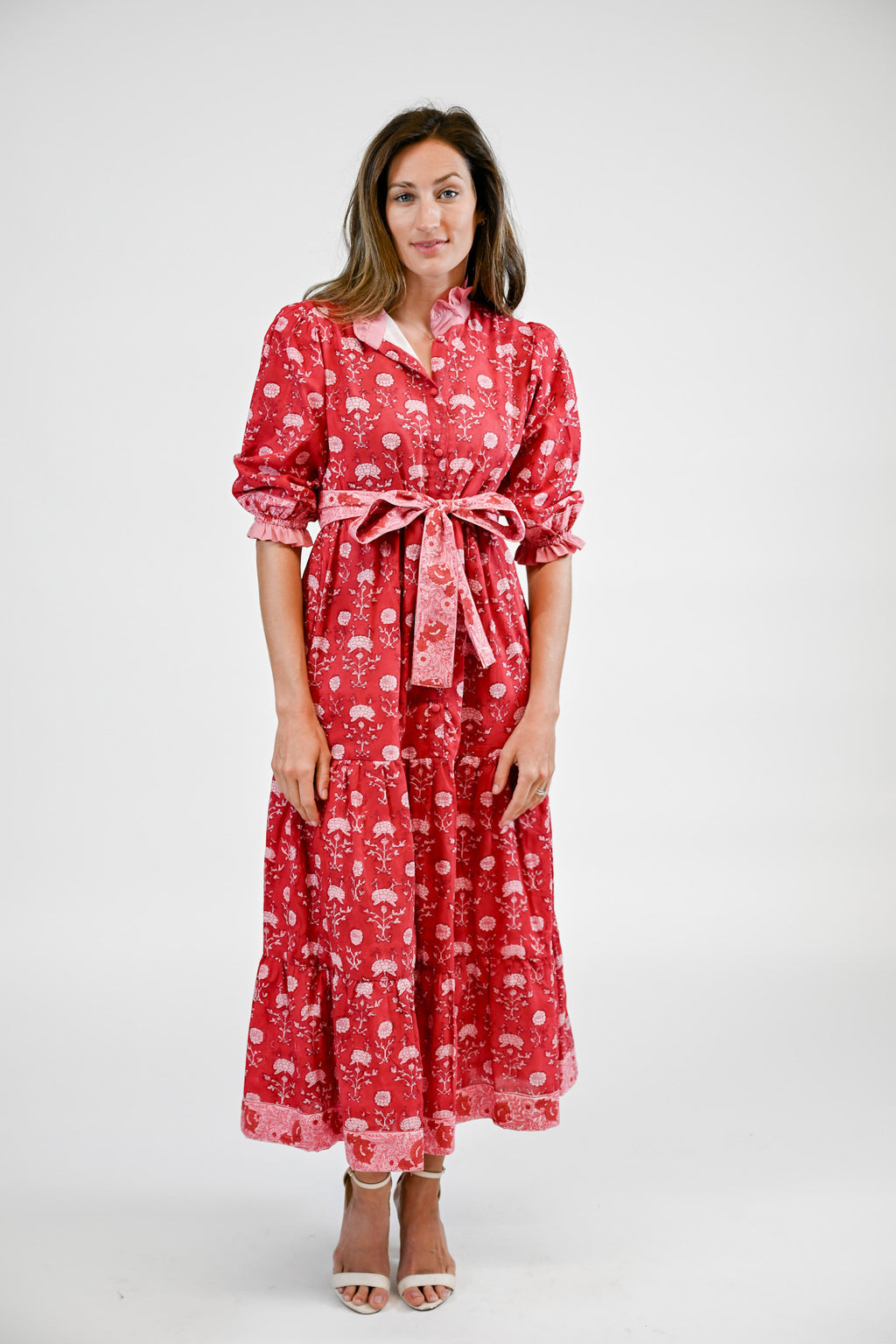 The Brooke features a ruffled collar, front button placket, gathered skirt, elbow length puff sleeves with contrasting ruffle cuffs, and side seam pockets.