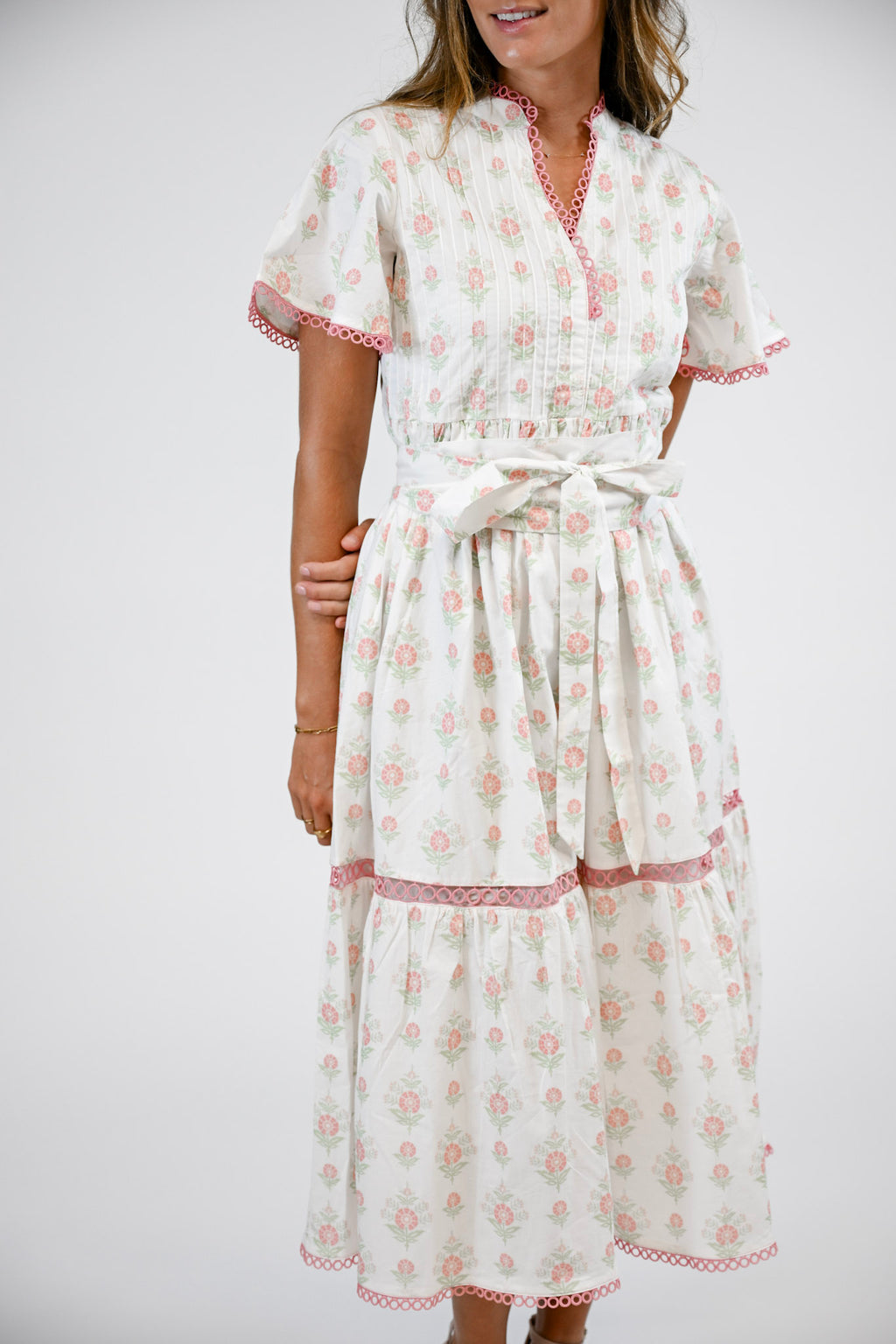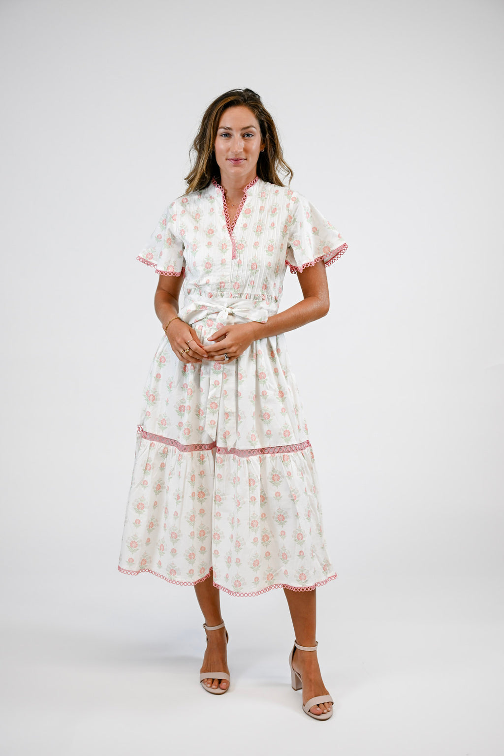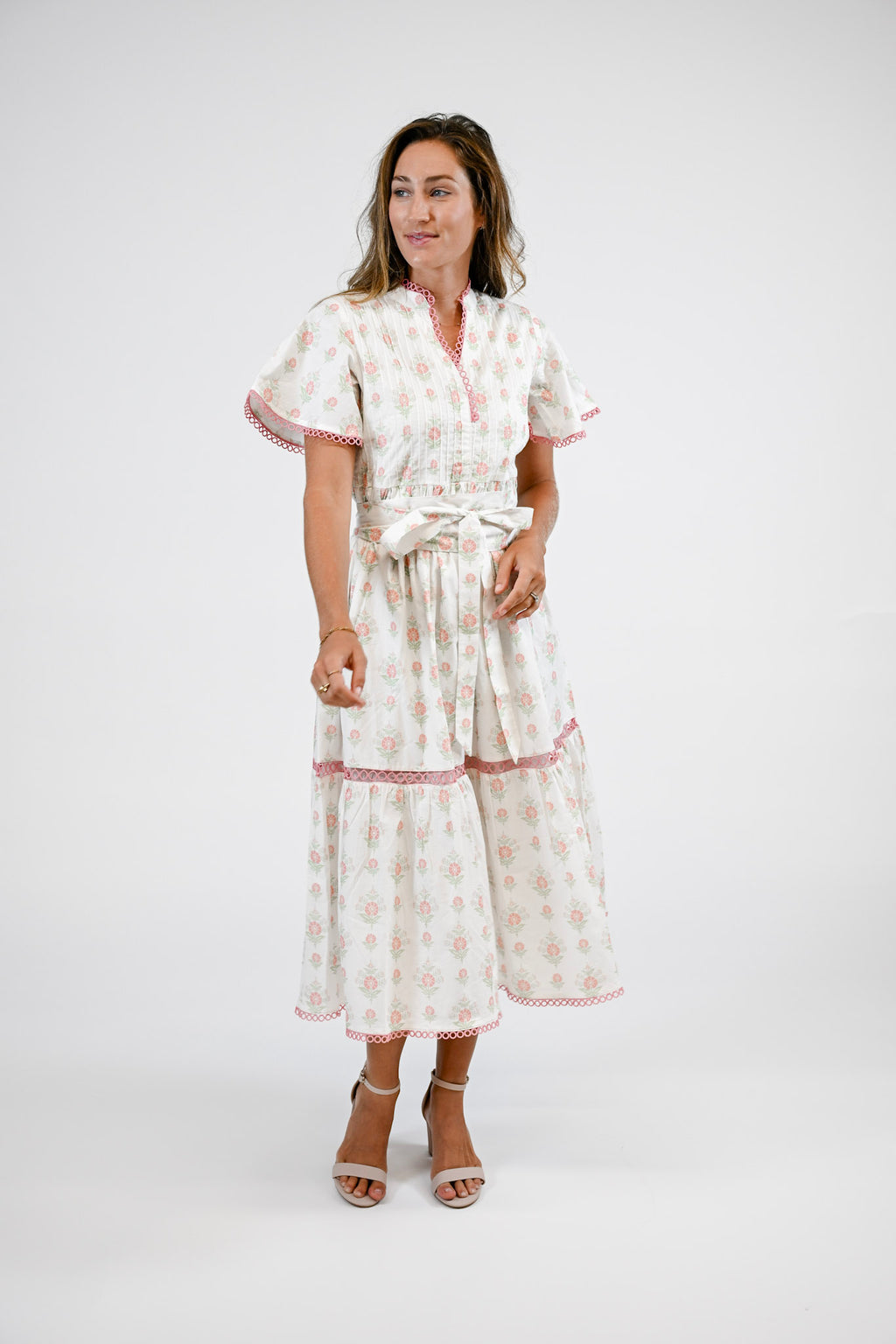 The Brynley features a flowy silhouette with tiered layers, short flutter sleeves, and a contrasting self-tie belt.