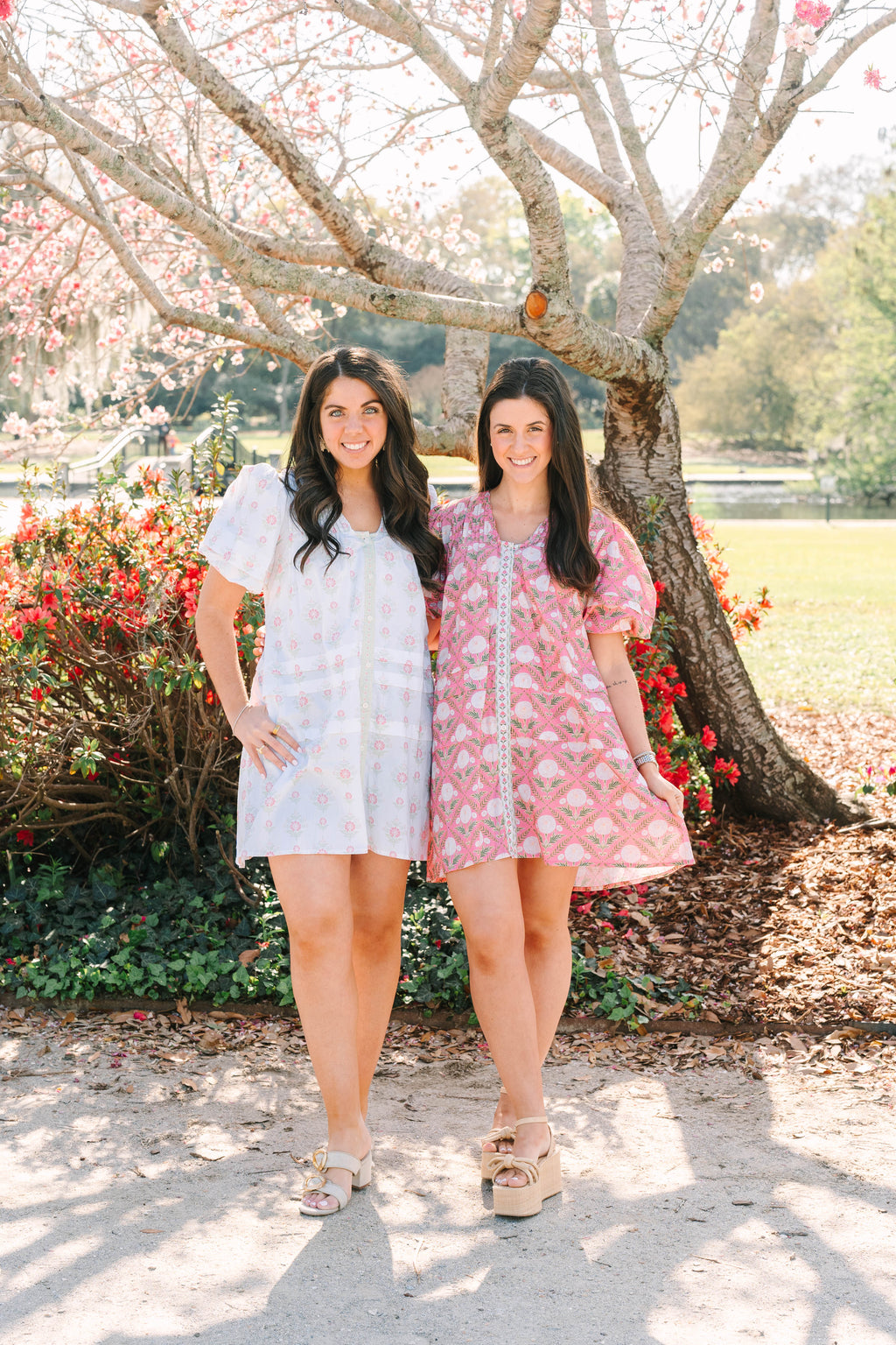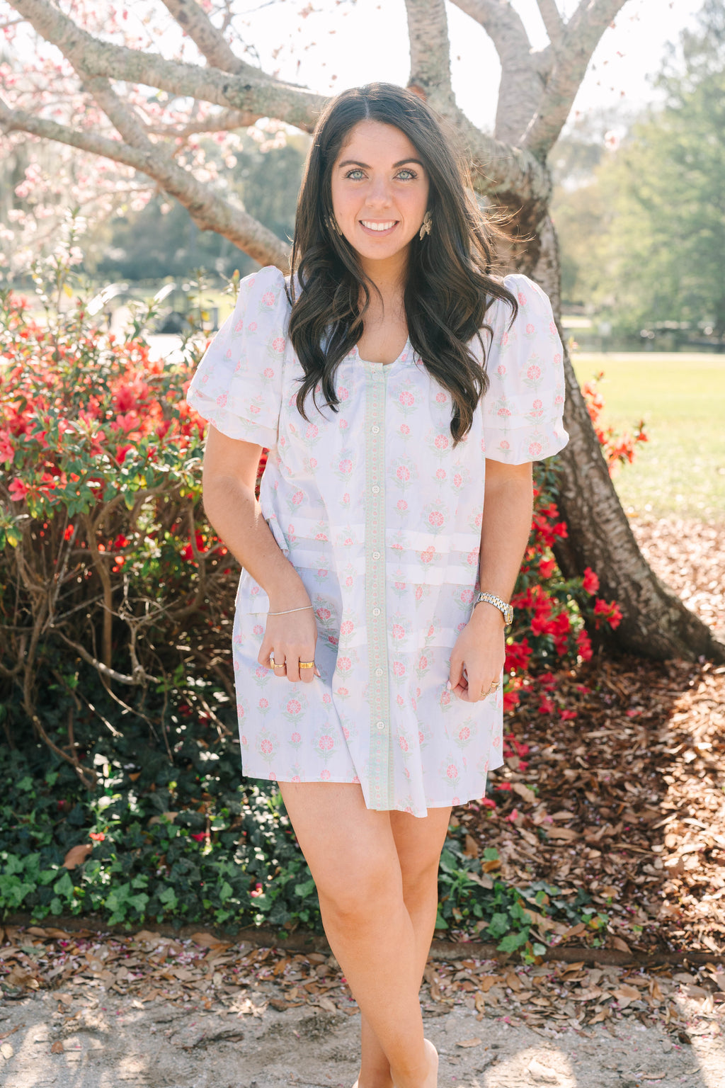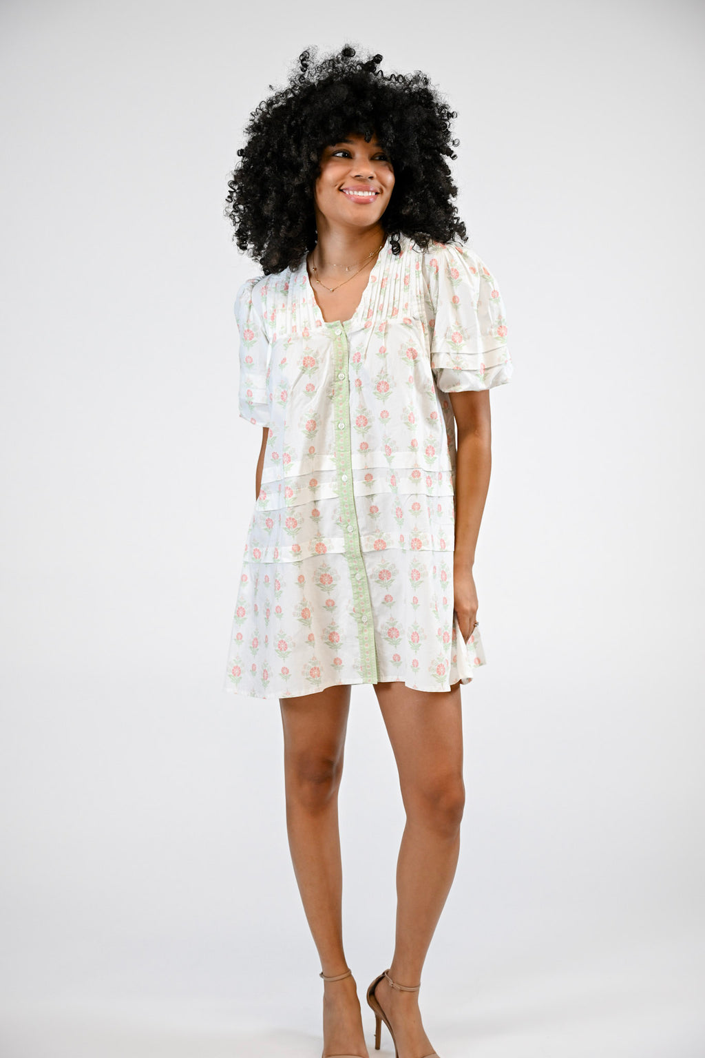 The Camille features short puff sleeves and a flattering A-line silhouette, perfect for any occasion. The front is adorned with decorative buttons and contrasting panels.