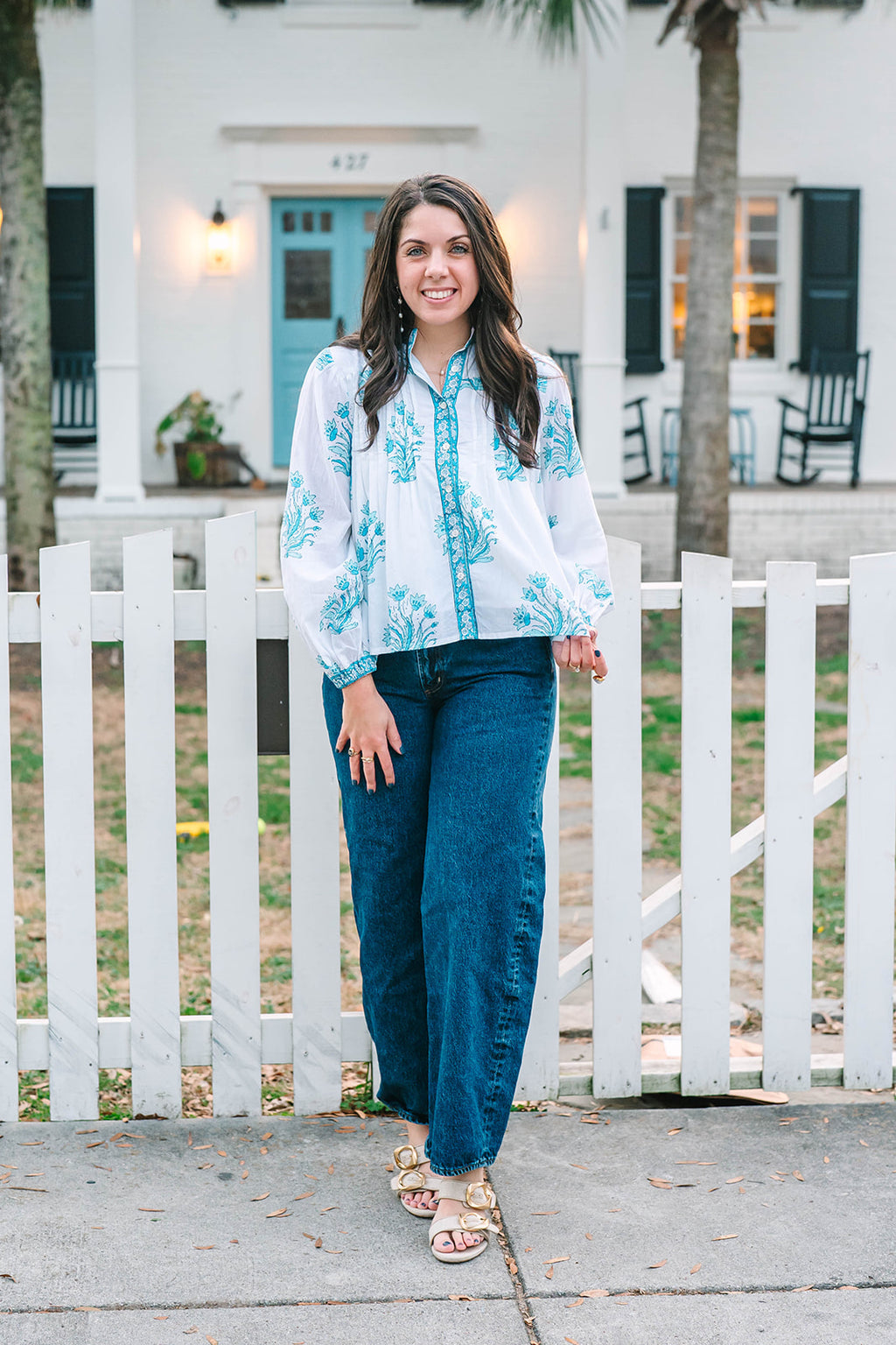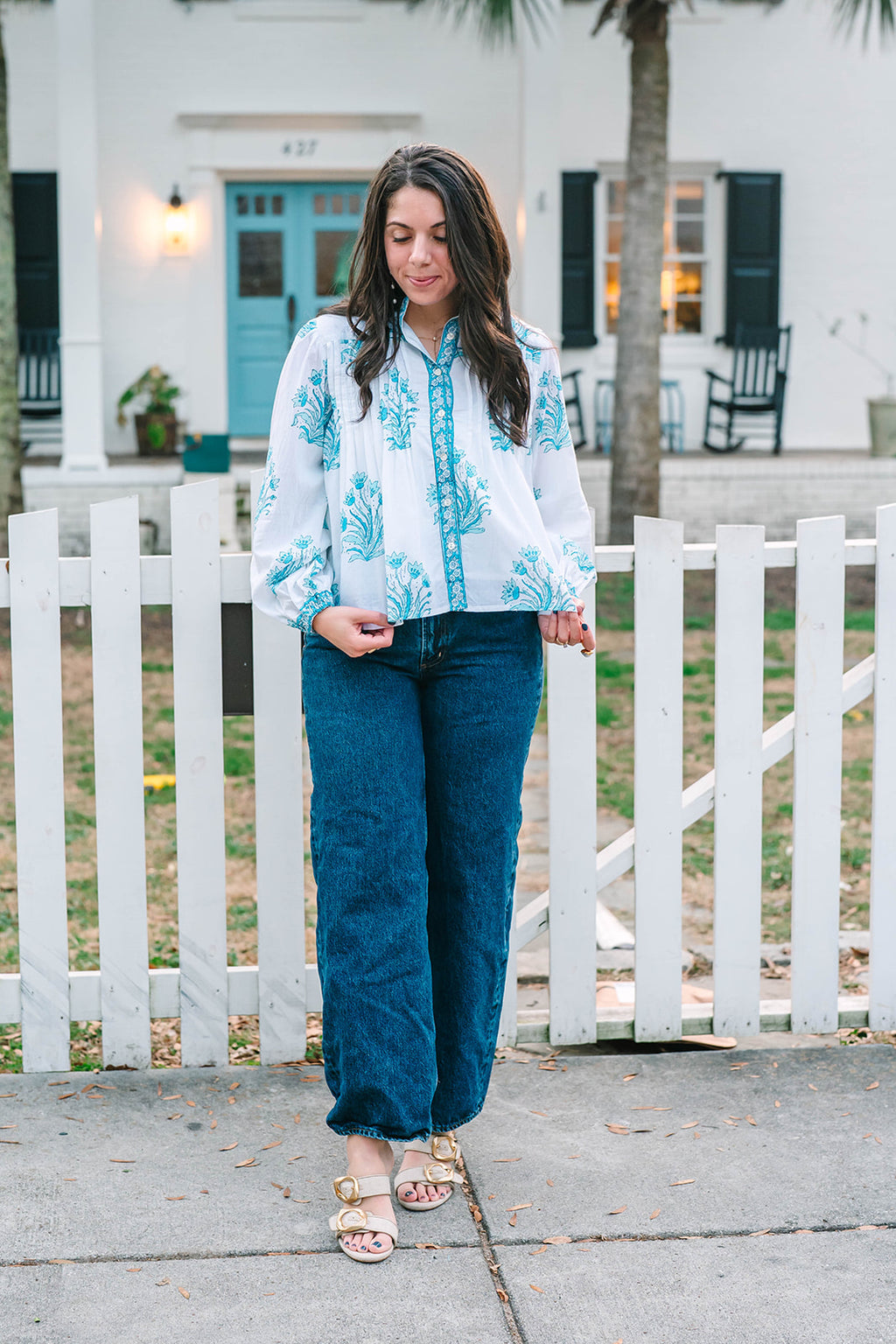 Effortlessly elegant and beautifully detailed, the Daisy Blouse is a timeless wardrobe staple. Designed with a relaxed fit silhouette and a refined mandarin collar, this piece features long balloon sleeves with elasticated cuffs for a touch of softness and ease. The front button placket is finished with luminous mother-of-pearl buttons, while delicate pintuck detailing and contrast patterns along the yoke and trim add signature sophistication. Perfect for pairing with tailored pants or denim for an elevated everyday look.