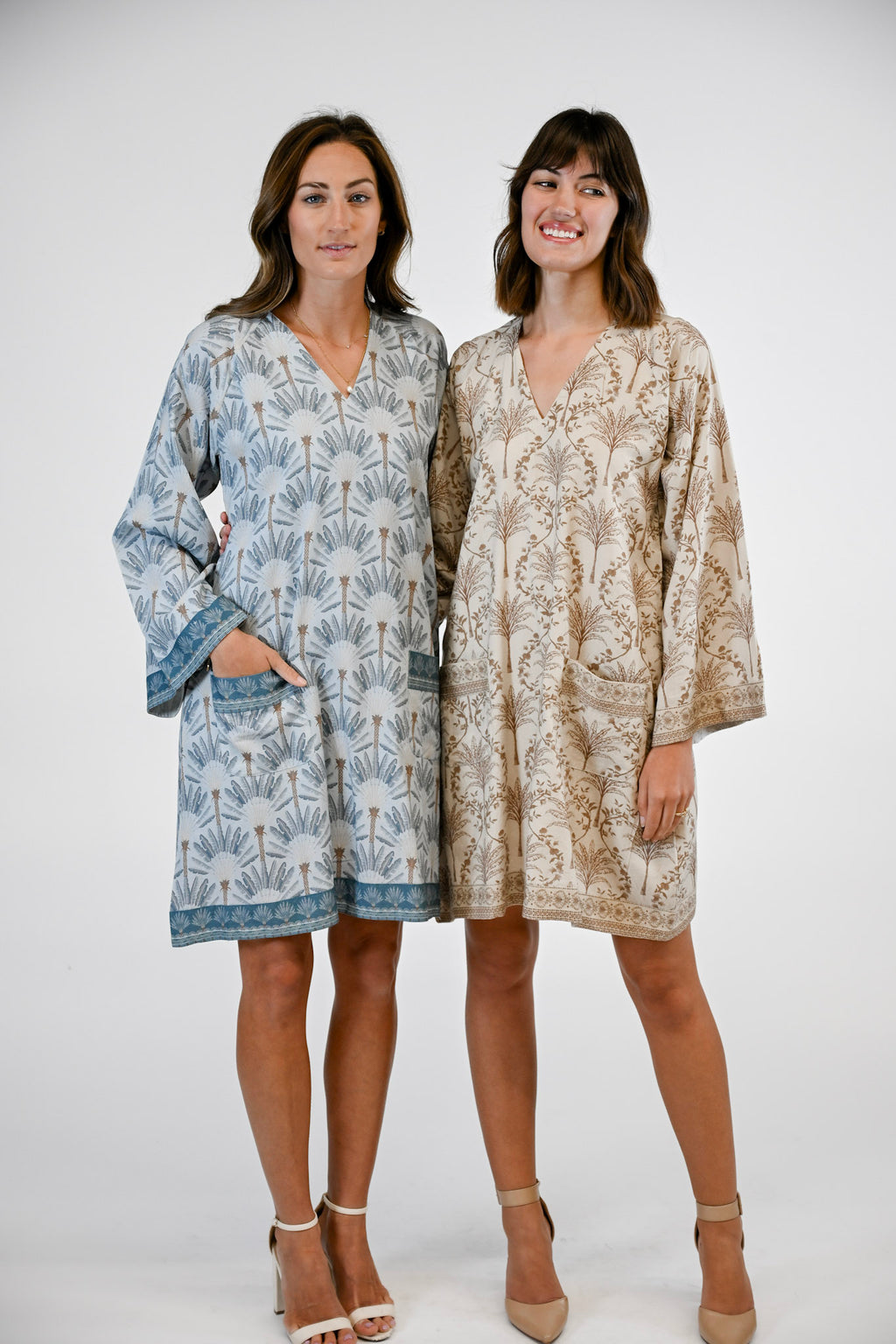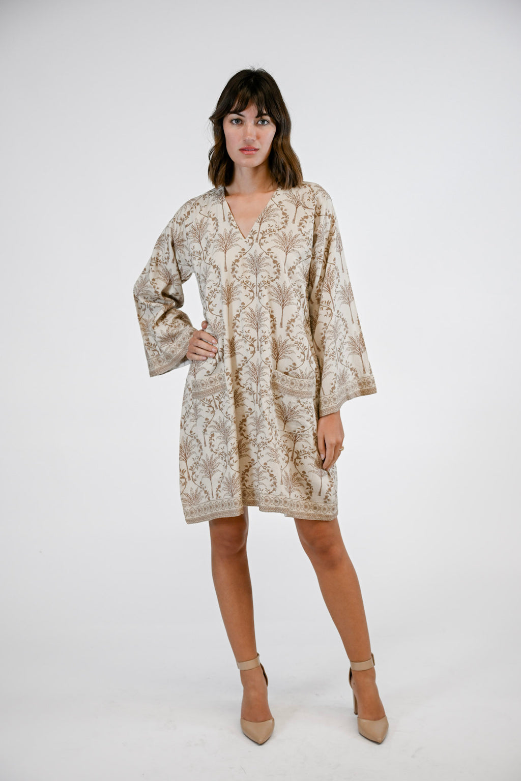 Modern sophistication meets effortless ease in the Eloise Mini Dress. Featuring a structured stand collar and flattering V-neckline, this design combines tailored detail with relaxed charm. Long, wide bell sleeves add graceful movement, while oversized front patch pockets bring a touch of casual functionality. Finished with a back invisible zipper and an easy, relaxed-fit silhouette, this piece offers comfort without compromising on style.