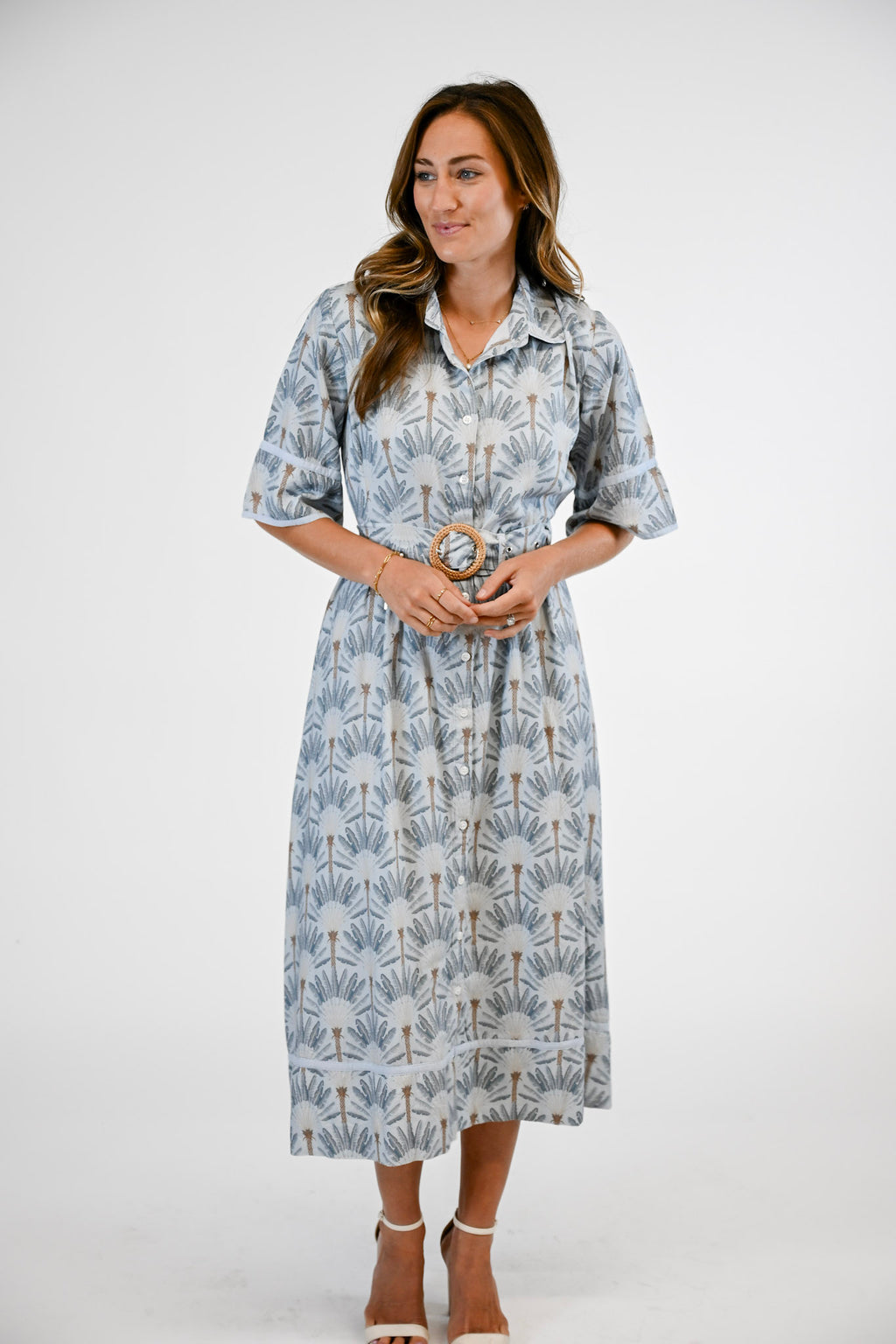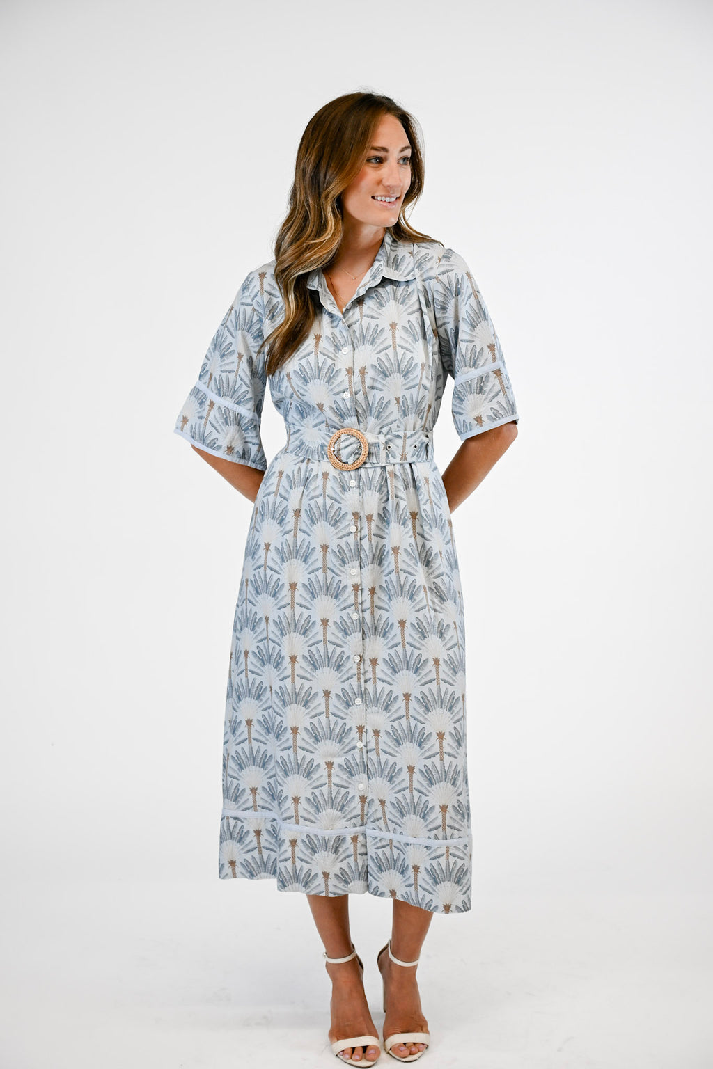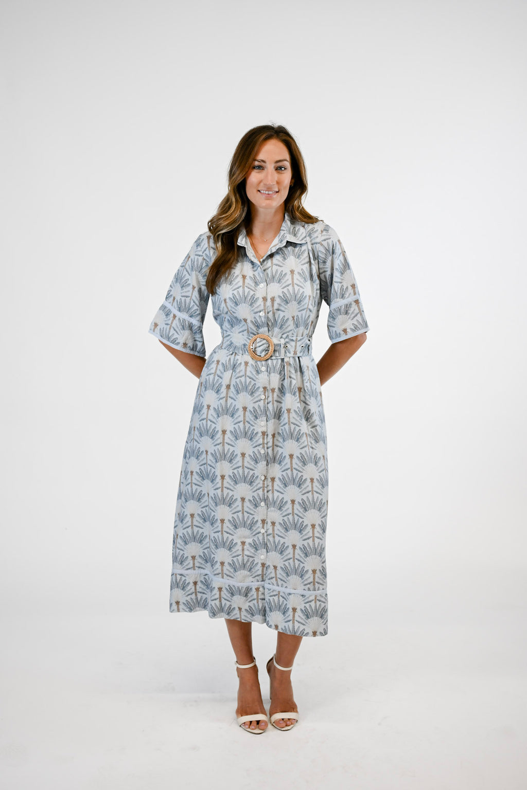Effortlessly refined and beautifully detailed, the Flora Dress blends classic tailoring with feminine ease. Designed with a collared neckline and front button placket, this silhouette flatters with an A-line skirt and graceful elbow-length bell sleeves. Thoughtful touches—contrast piping and side pockets—add both charm and functionality. Finished with a coordinating belt, the Flora offers timeless versatility for any occasion.