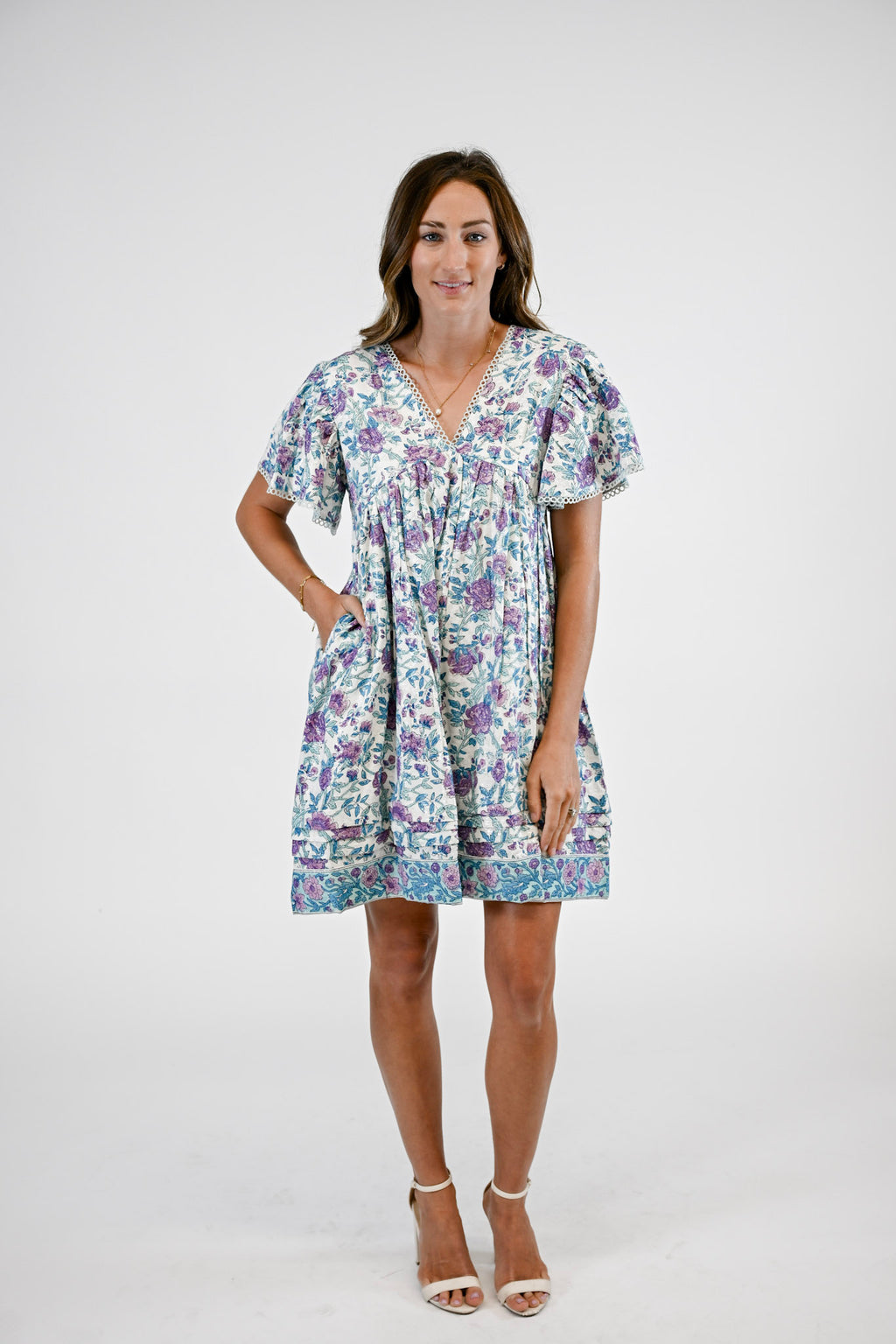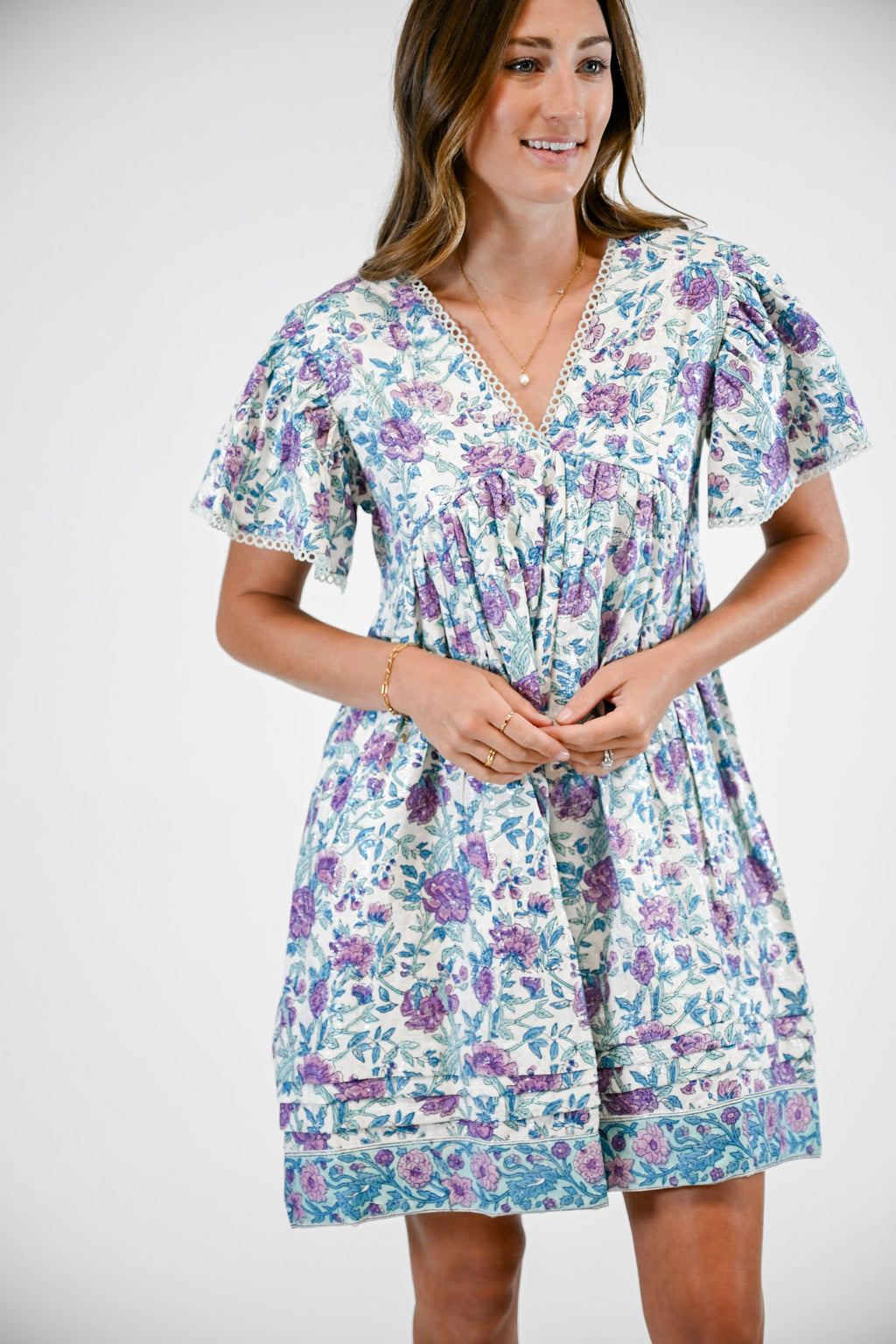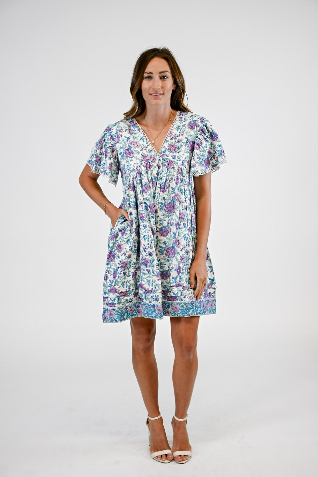 Playful yet polished, the Greta Dress is your new go-to mini for effortless style. Designed with a flattering V-neckline and finished with delicate, flirty trim along the neckline and sleeves, this piece exudes feminine charm. Perfect for daytime outings or evening gatherings, the Greta offers an easy, elevated look for any occasion.