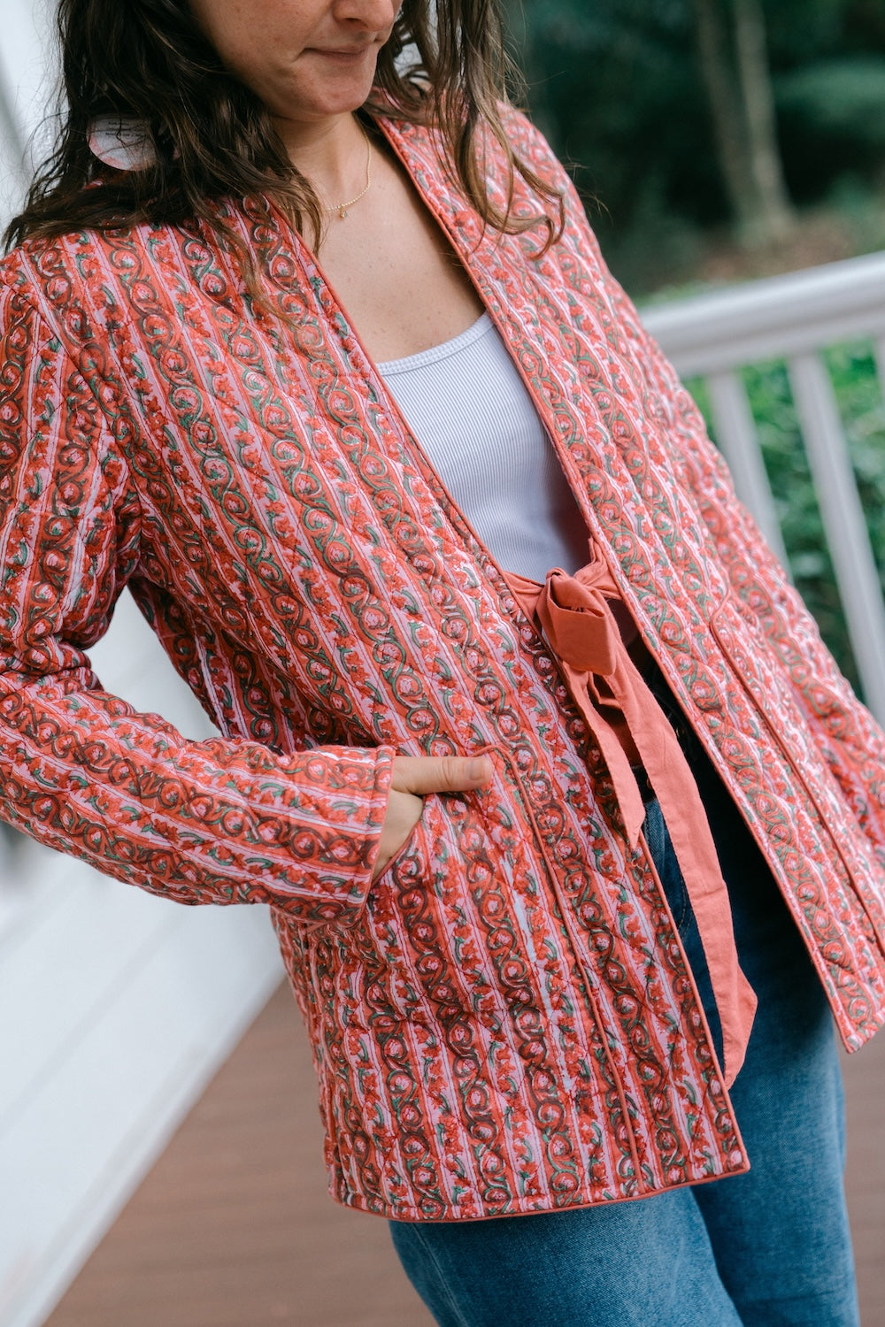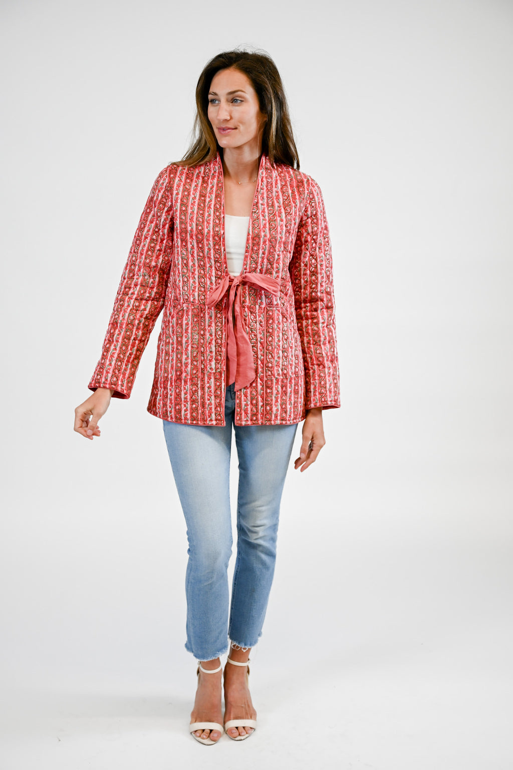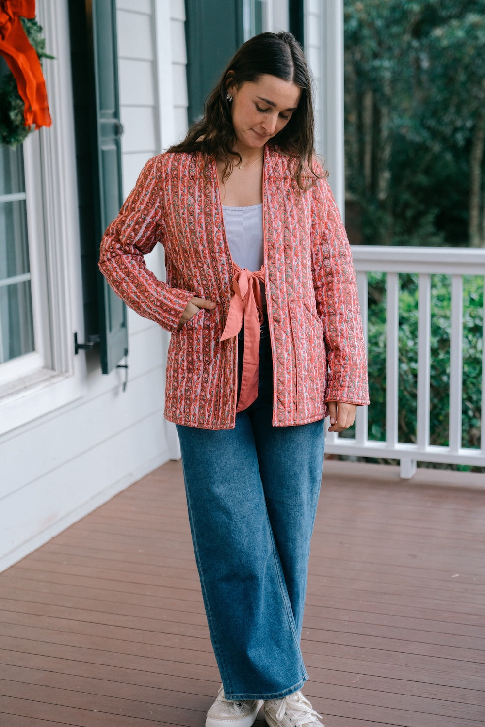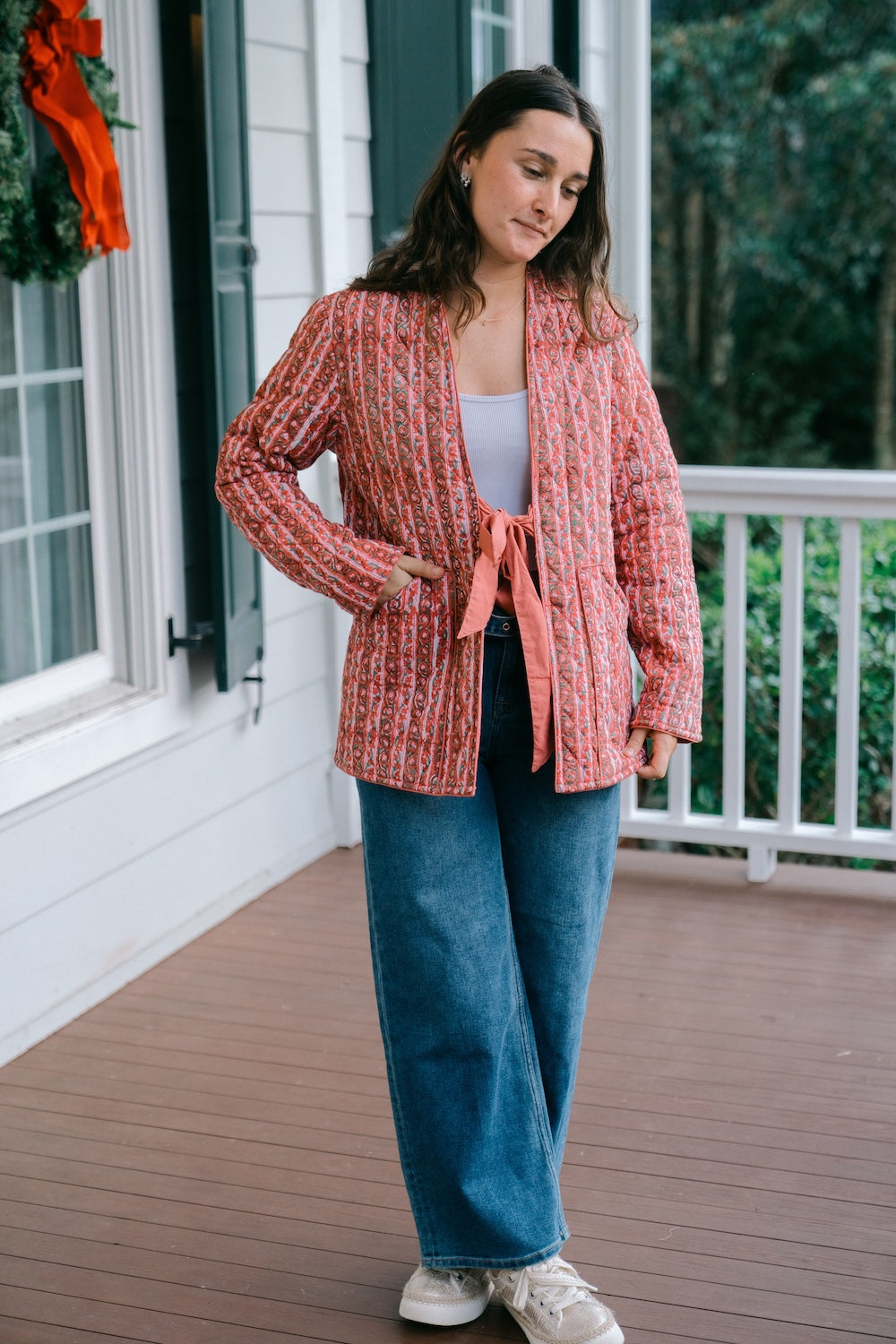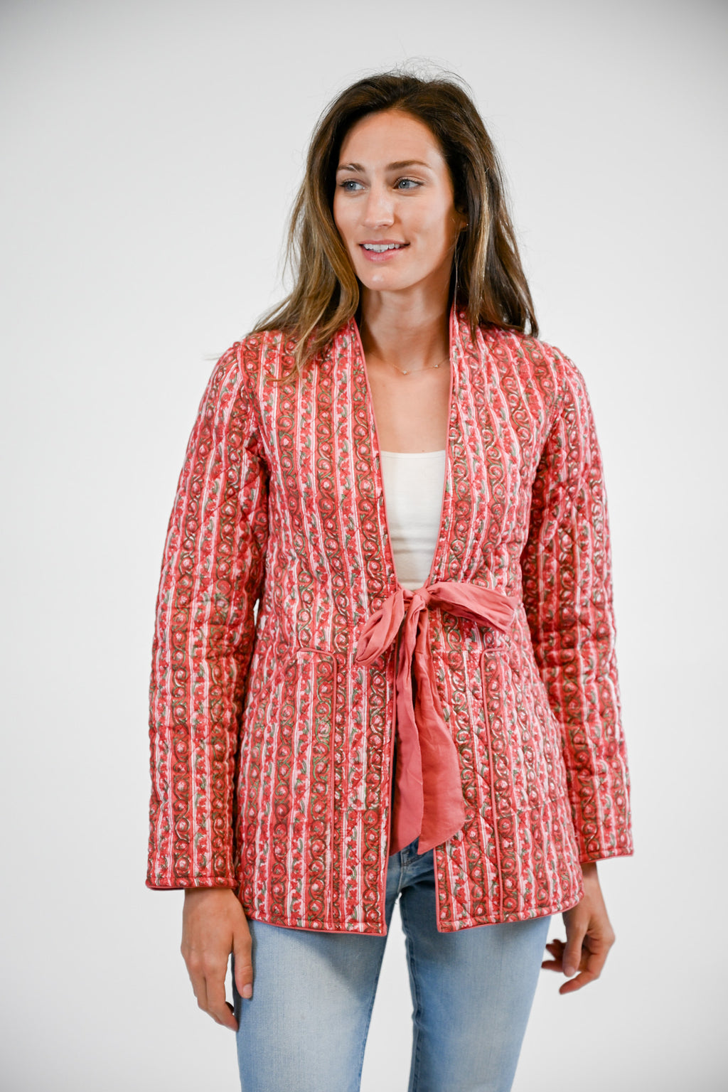The Lennox Jacket is a full length quilted jacket that features front pockets and a matching front tie.