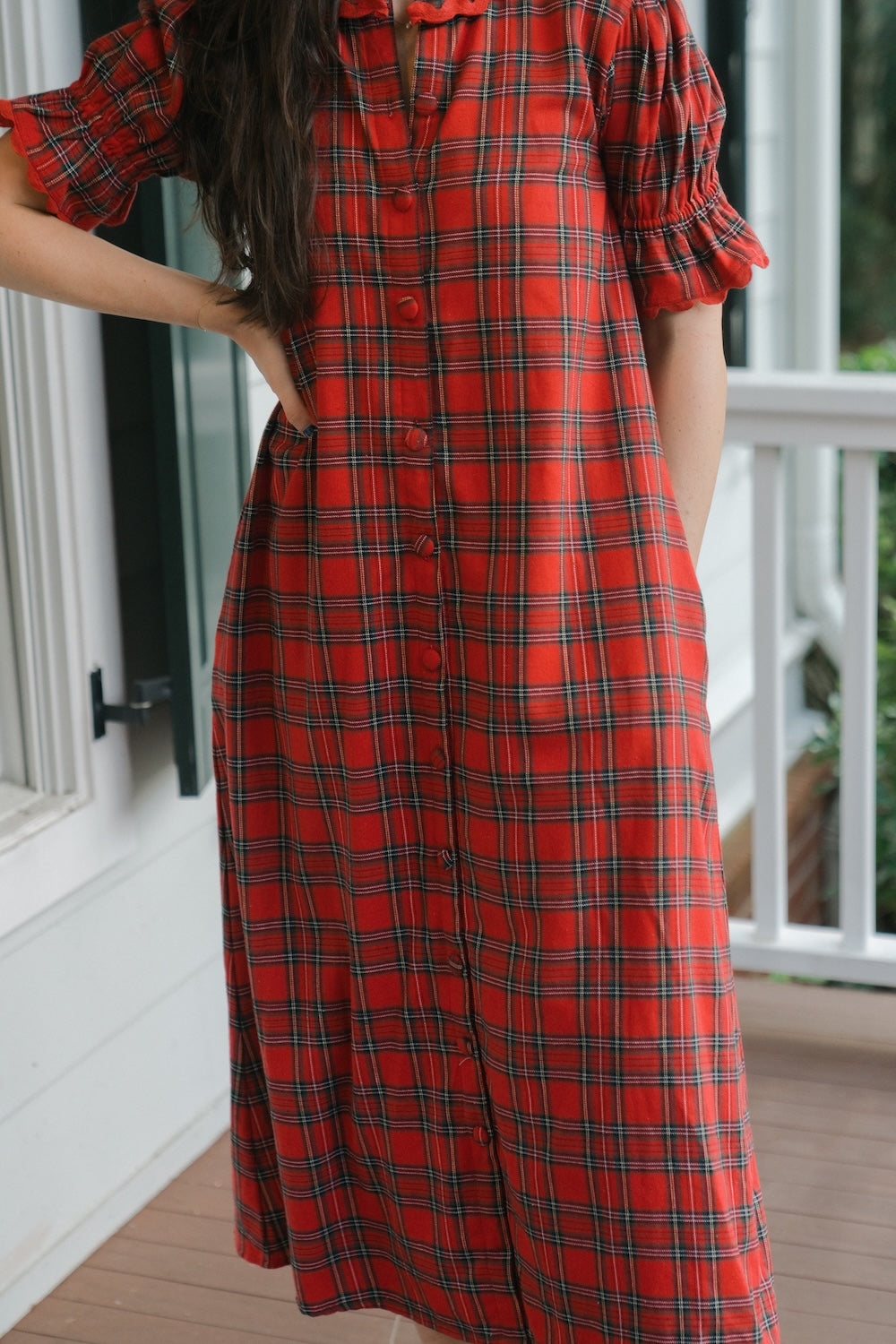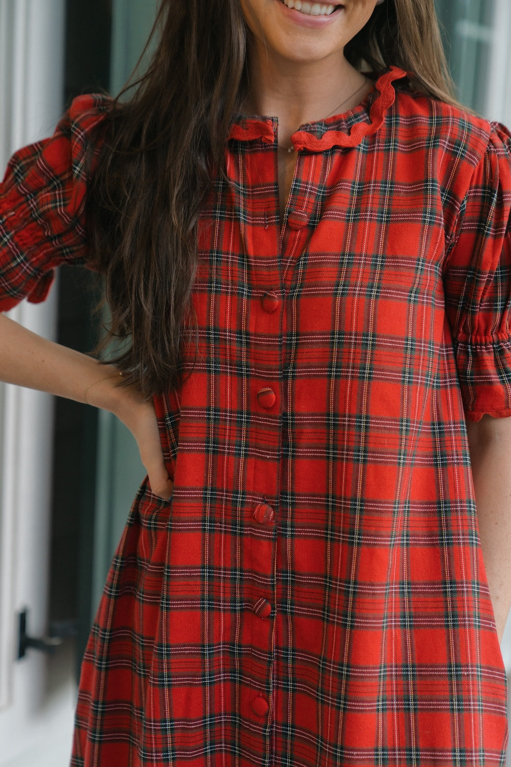 The Liliana is a relaxed fit silhouette that features a button-front design with short puff sleeves, ruffle trim details, and side pockets.