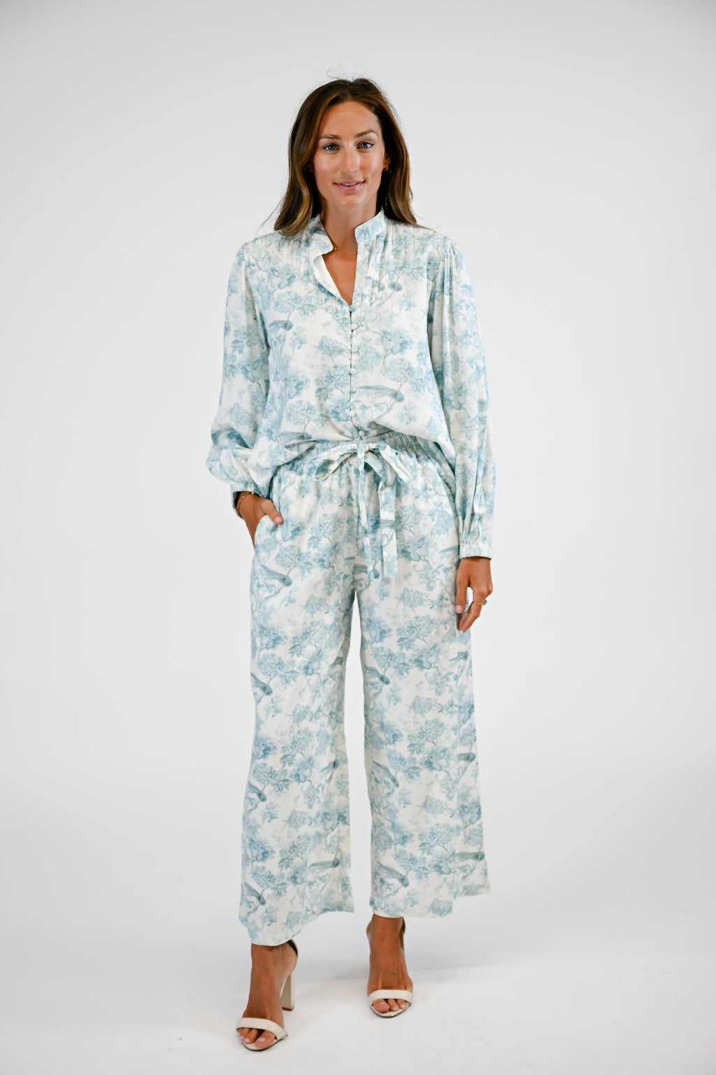 Timeless and effortlessly elegant, the Verity Blouse is designed with a relaxed silhouette that drapes beautifully for a flattering fit. Featuring a mandarin split collar, a front button placket with fabric-covered buttons, and long balloon sleeves finished with elasticated cuffs, every detail exudes refined femininity. Pair with the coordinating Verity Pant for the perfect ensemble